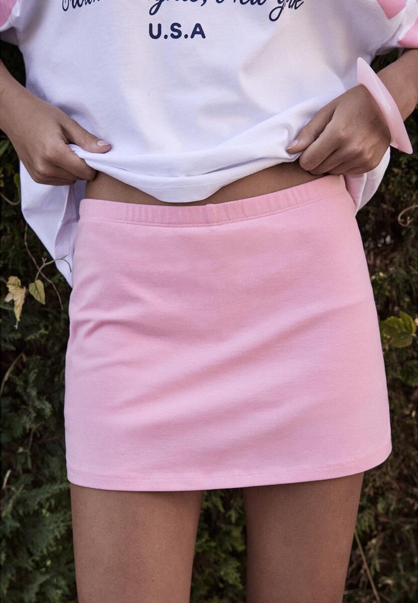 Skort realizzata in tessuto misto cotone ed elastan. Vita media con elastico in vita. Disponibile in diversi colori.