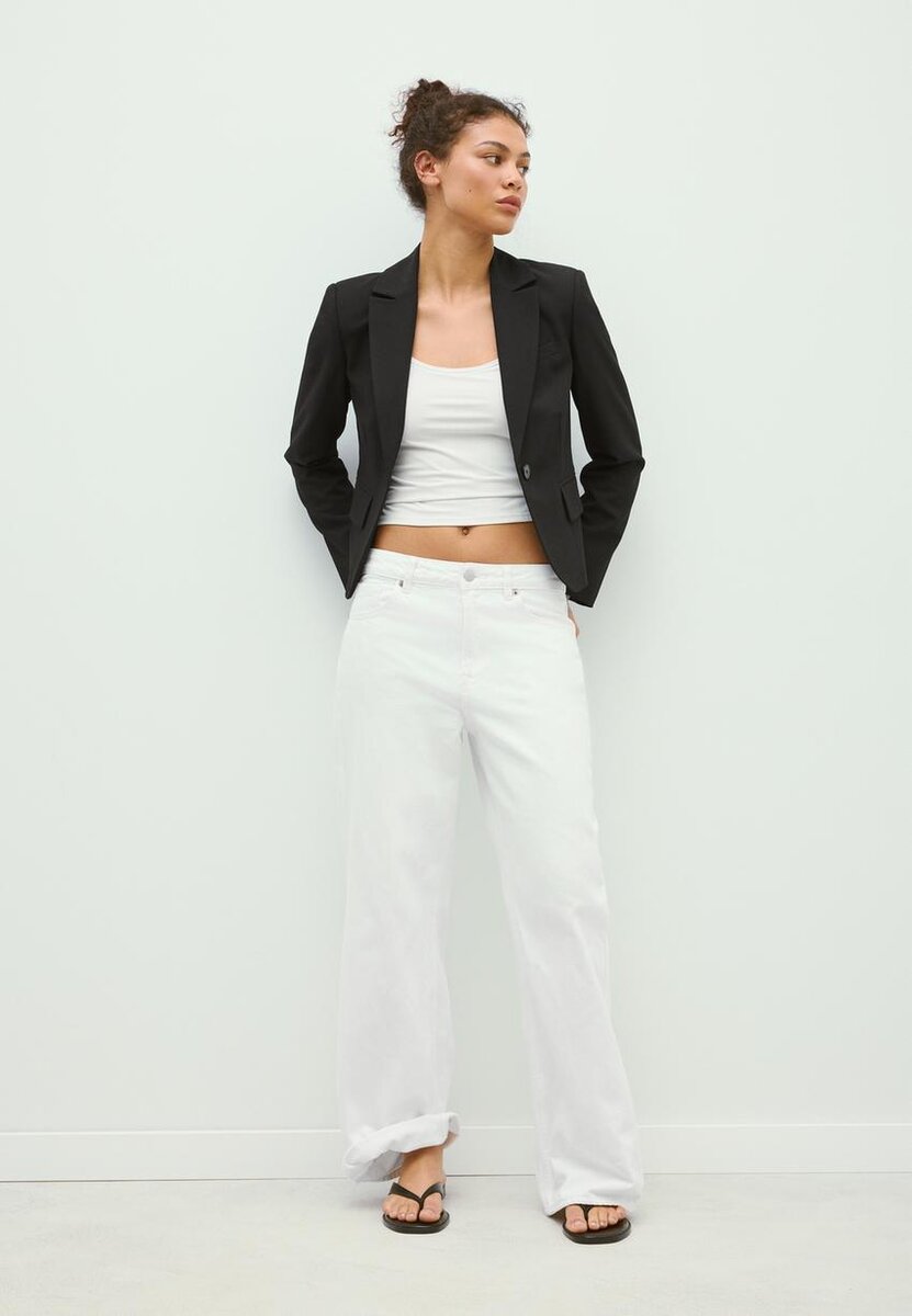 Blazer corto realizzato in tessuto misto viscosa elasticizzato per un maggiore comfort e libertà di movimento. Colletto con revers e maniche lunghe flared. Tasche a filetto con patta sul davanti. Chiusura frontale con bottoni. Disponibile in diversi colori.