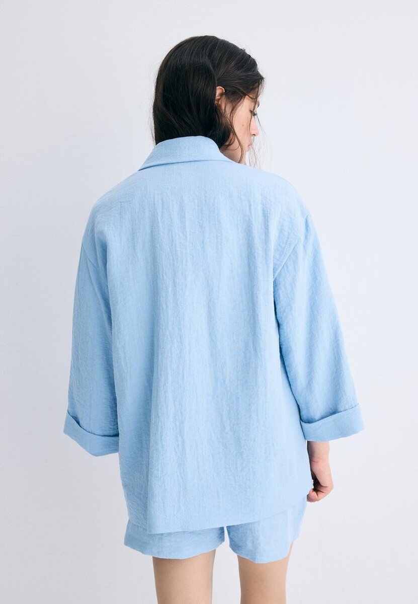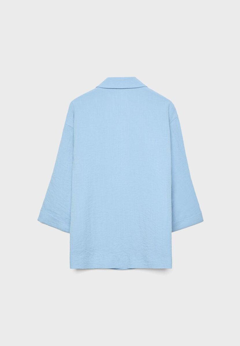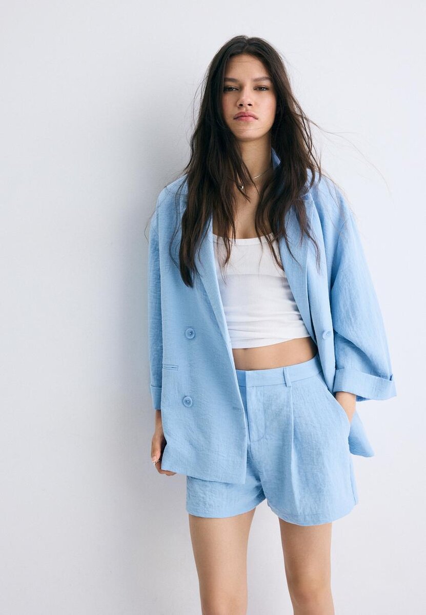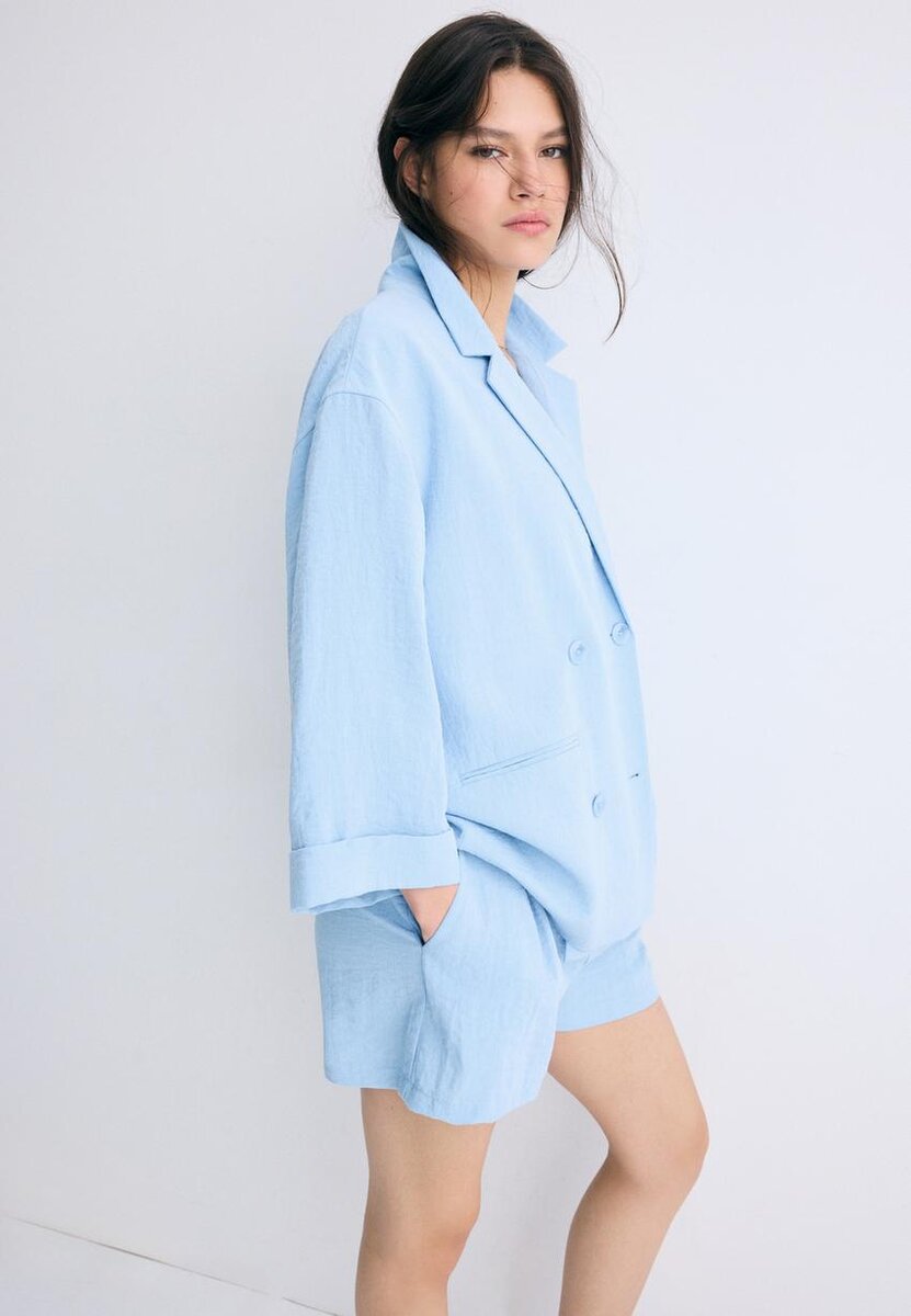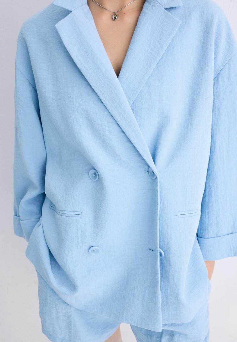 Blazer fluido con collo a V con revers e maniche lunghe. Dotato di tasche a filetto sul davanti e chiusura a doppio petto con bottoni. Disponibile in diversi colori.