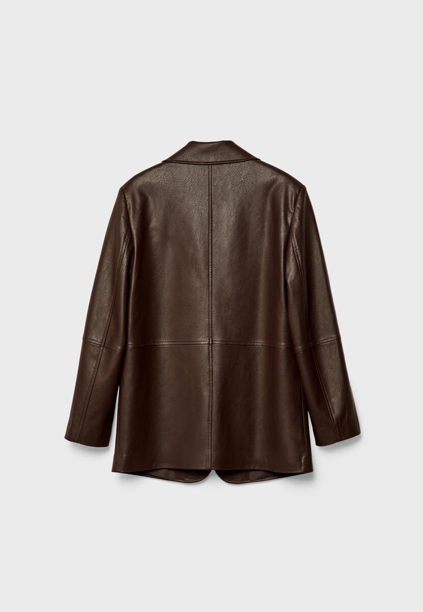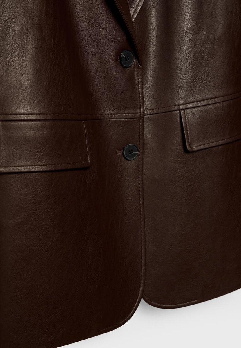 Blazer realizzato in tessuto effetto pelle. Colletto con revers e maniche lunghe. Tasche con patta sul davanti. Chiusura frontale con bottoni.