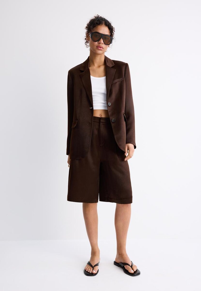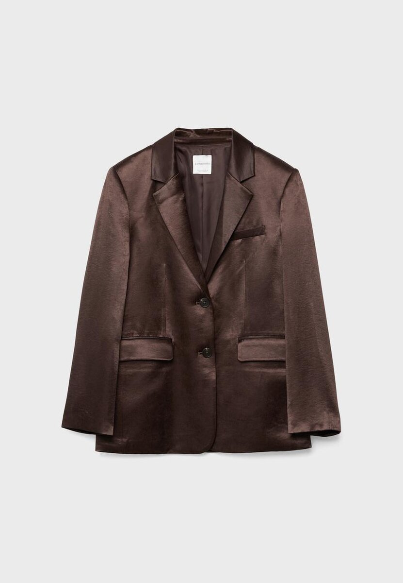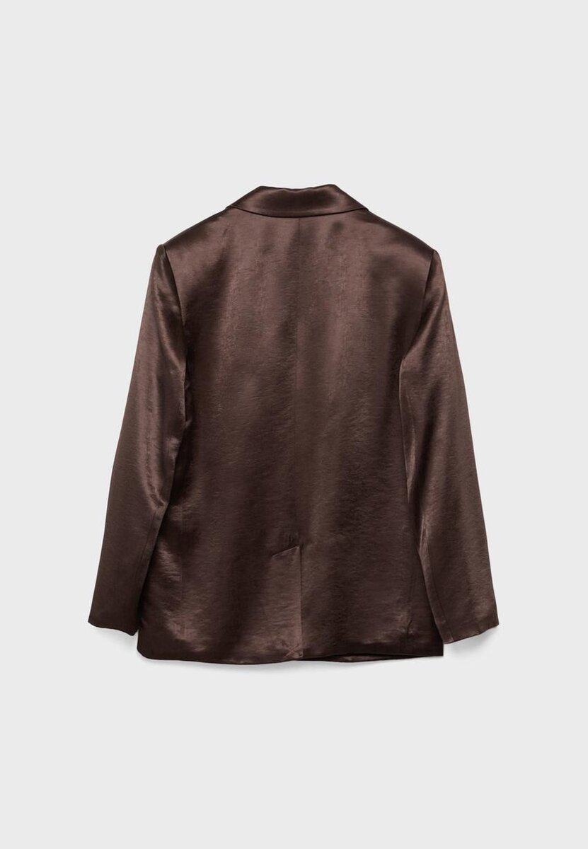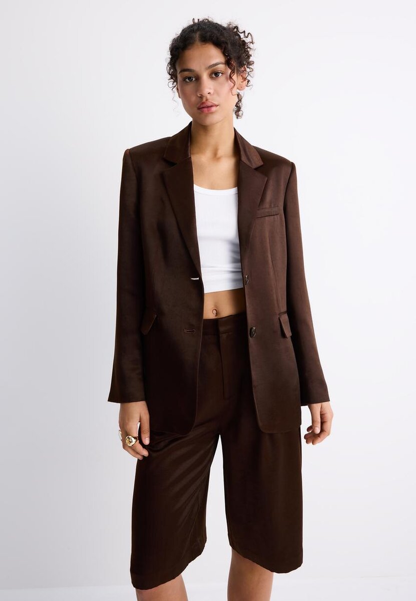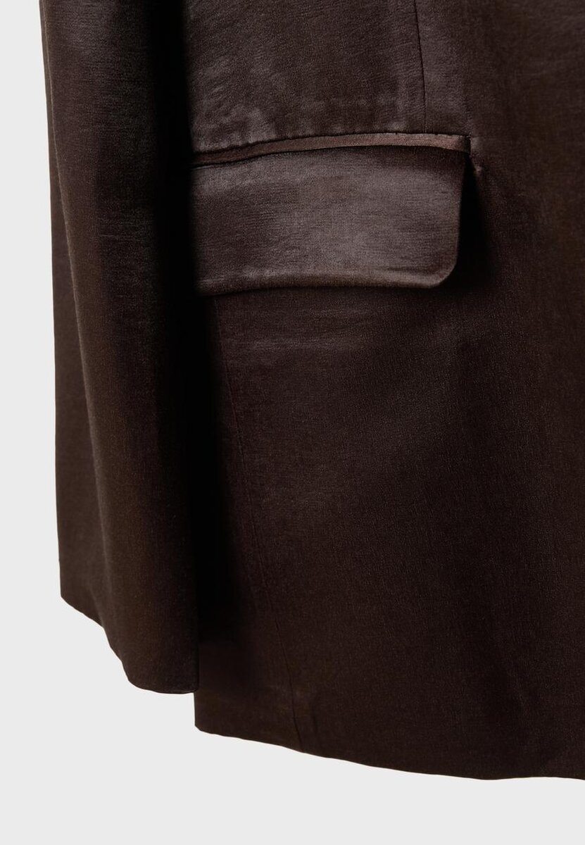 Blazer dalla linea dritta realizzato in tessuto misto viscosa con finitura satinata. Colletto con revers e maniche lunghe. Tasche a filetto con patta sul davanti e una tasca a filetto sul petto. Chiusura frontale con bottoni.