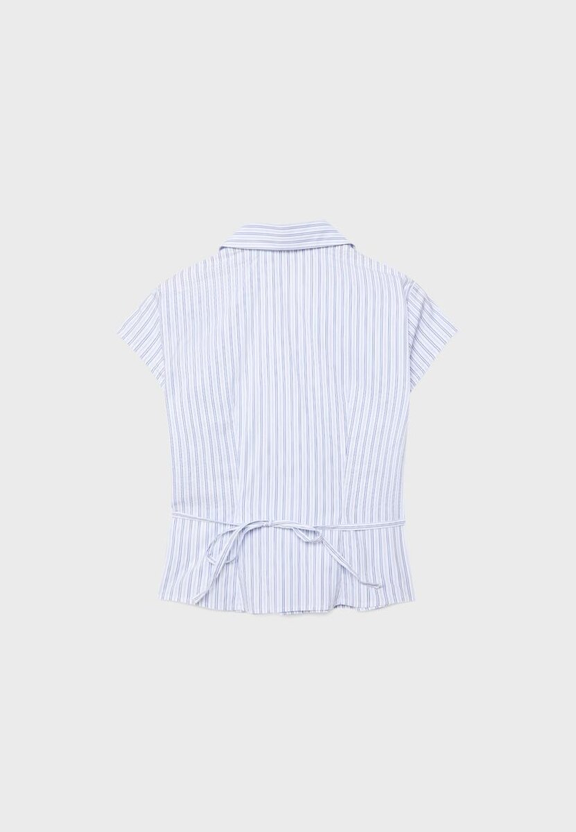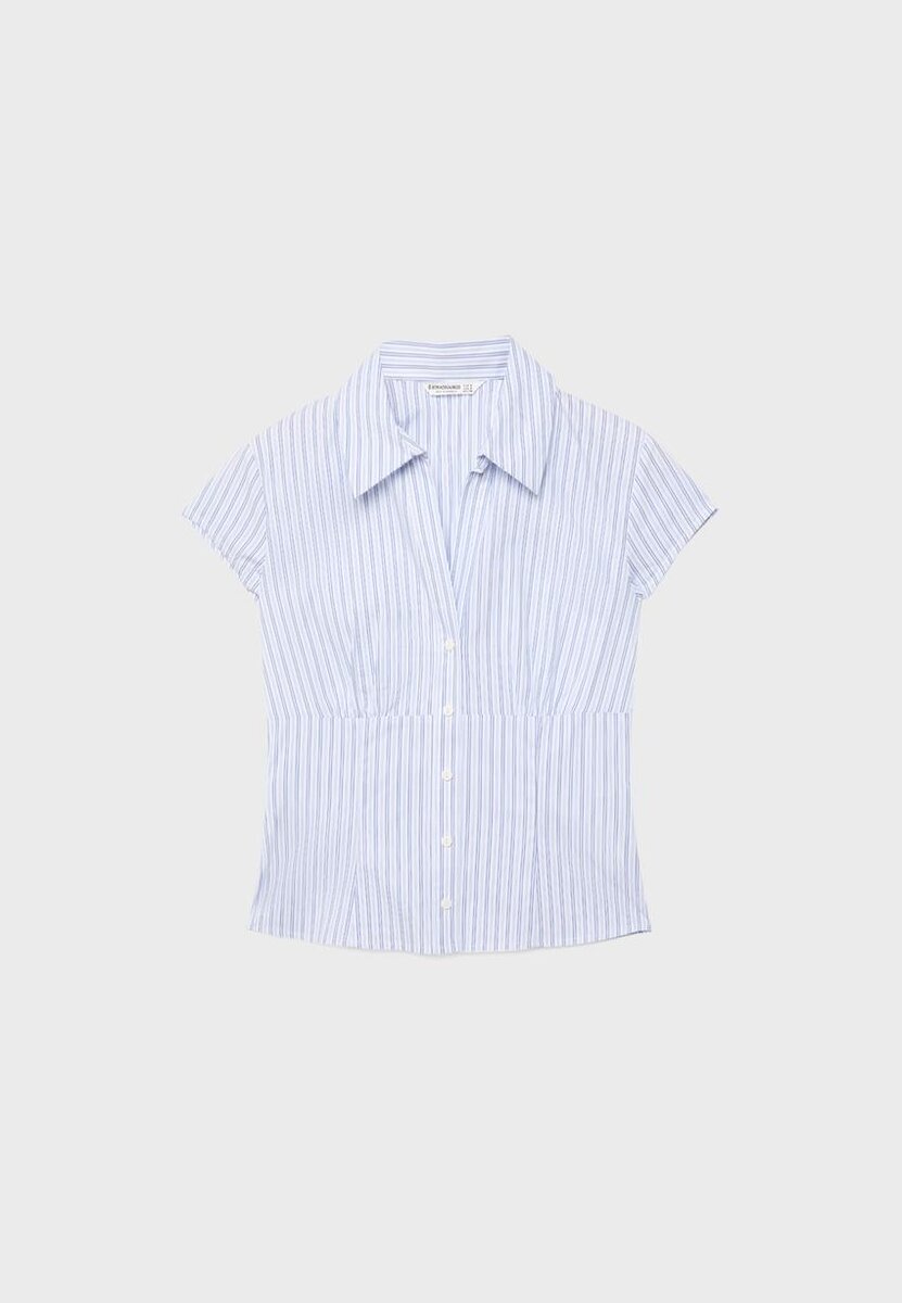 Camicia con colletto a V e maniche corte. Chiusura frontale con bottoni. Caratterizzata da cucitura sotto il seno e vita aderente. Disponibile in diversi colori.