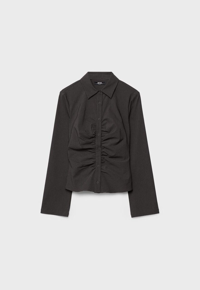 Camicia aderente con collo a revers e maniche lunghe. Chiusura frontale con bottoni e dettaglio arricciato sul davanti. Disponibile in una vasta gamma di colori.
