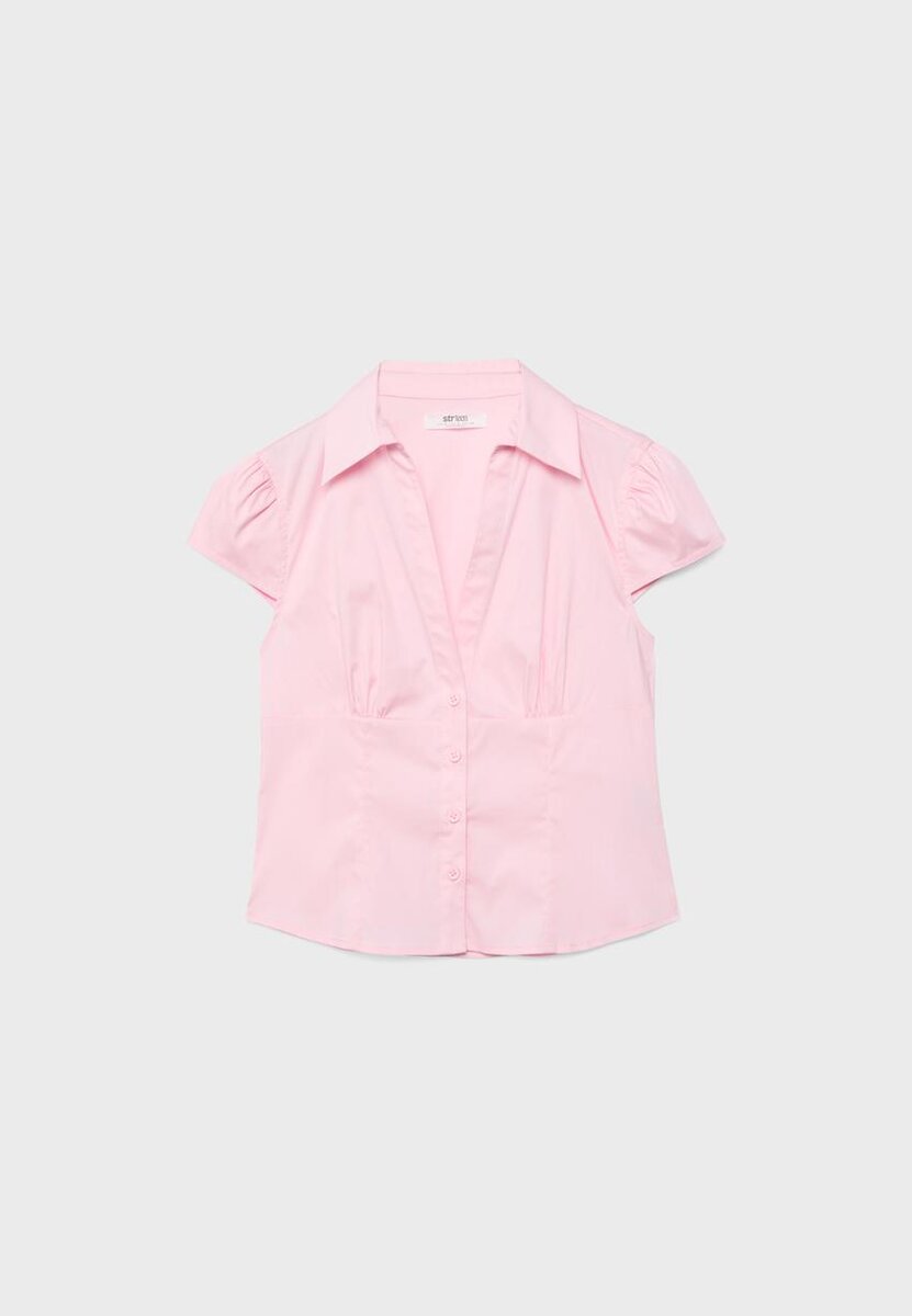 Camicia aderente con collo a revers e scollo a V, maniche corte e chiusura frontale con bottoni. Disponibile in vari colori.