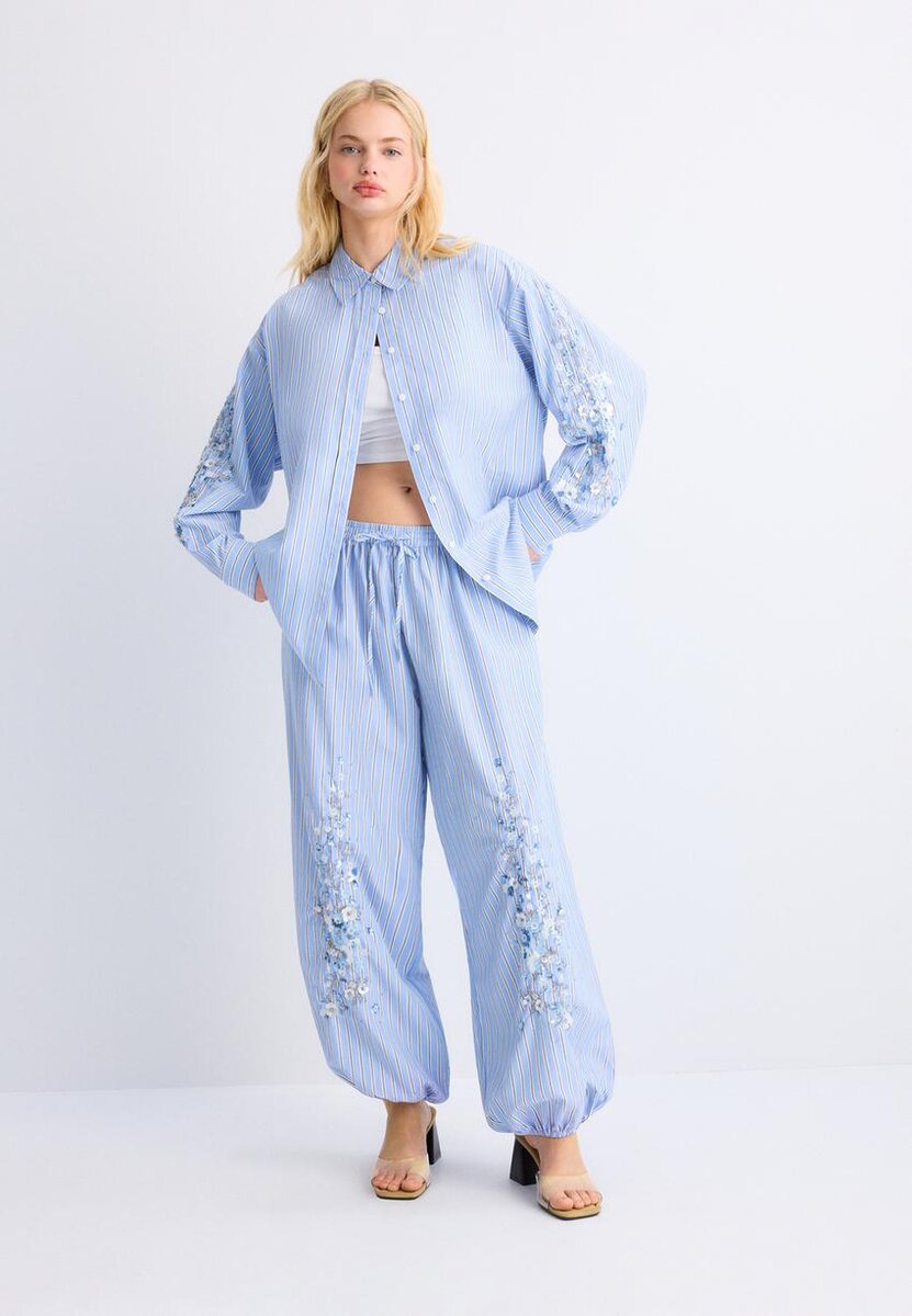 Camicia in cotone dal taglio dritto con colletto alla coreana e maniche lunghe con polsini. Caratterizzata da ricami di paillettes sulle maniche e chiusura frontale con bottoni.