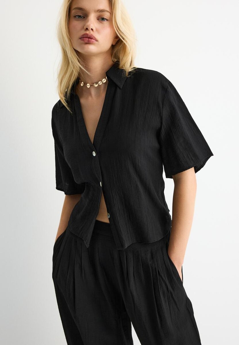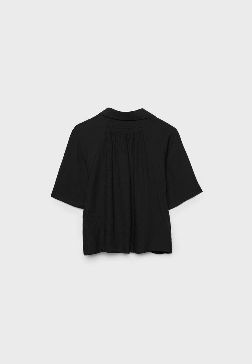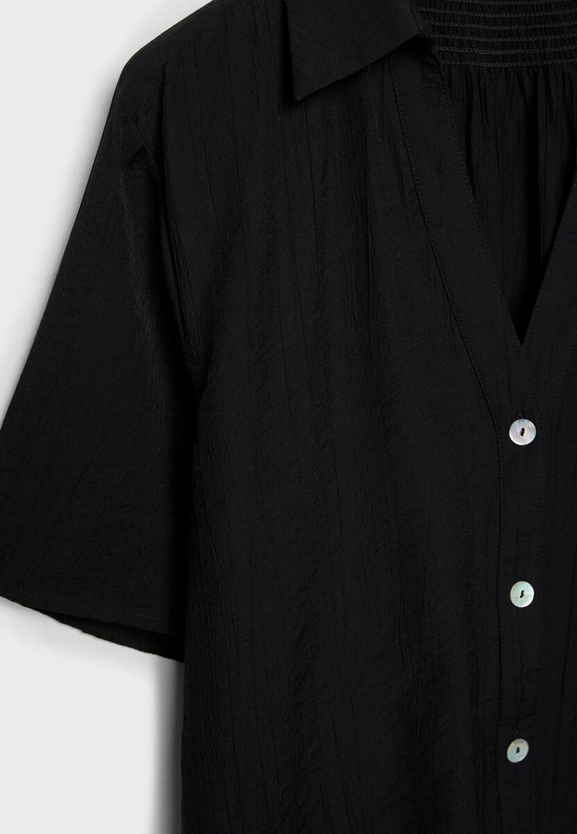 Camicia fluida con colletto e maniche corte. Caratterizzata da chiusura frontale con bottoni e dettaglio in tessuto a nido d’ape sul retro. Disponibile in diversi colori.