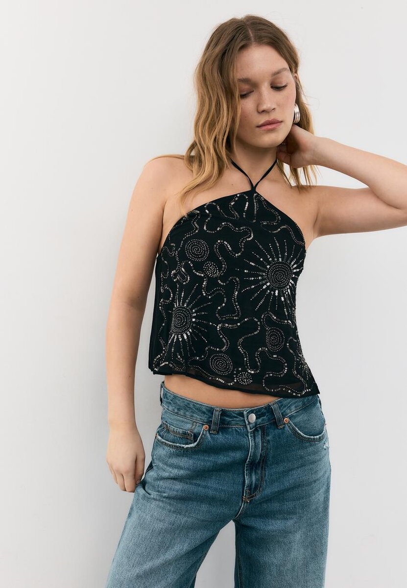Top realizzato in tessuto di viscosa. Scollo all’americana con chiusura a lacci sul retro e spalline sottili. Dettagli ricamati con applicazioni di perline. Orlo ondulato.