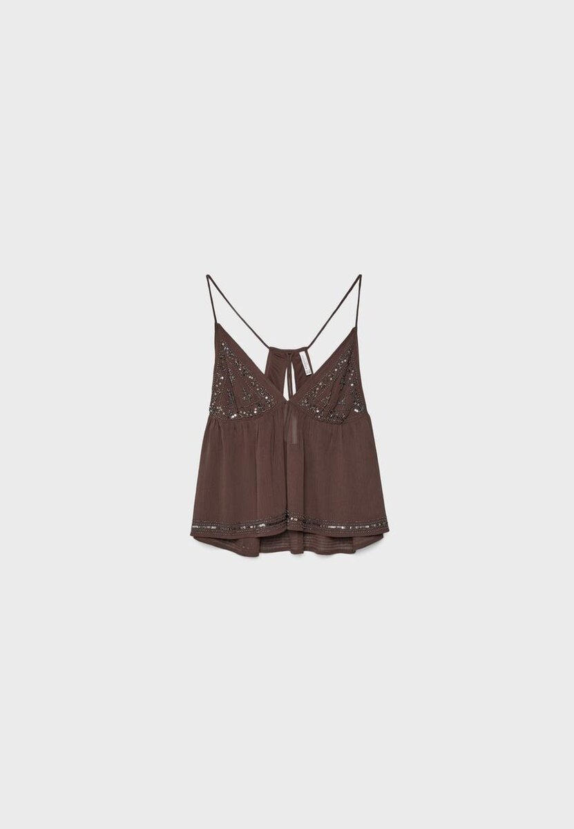 Top fluido con scollo a V e spalline sottili. Presenta dettagli ricamati.
