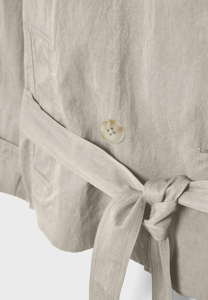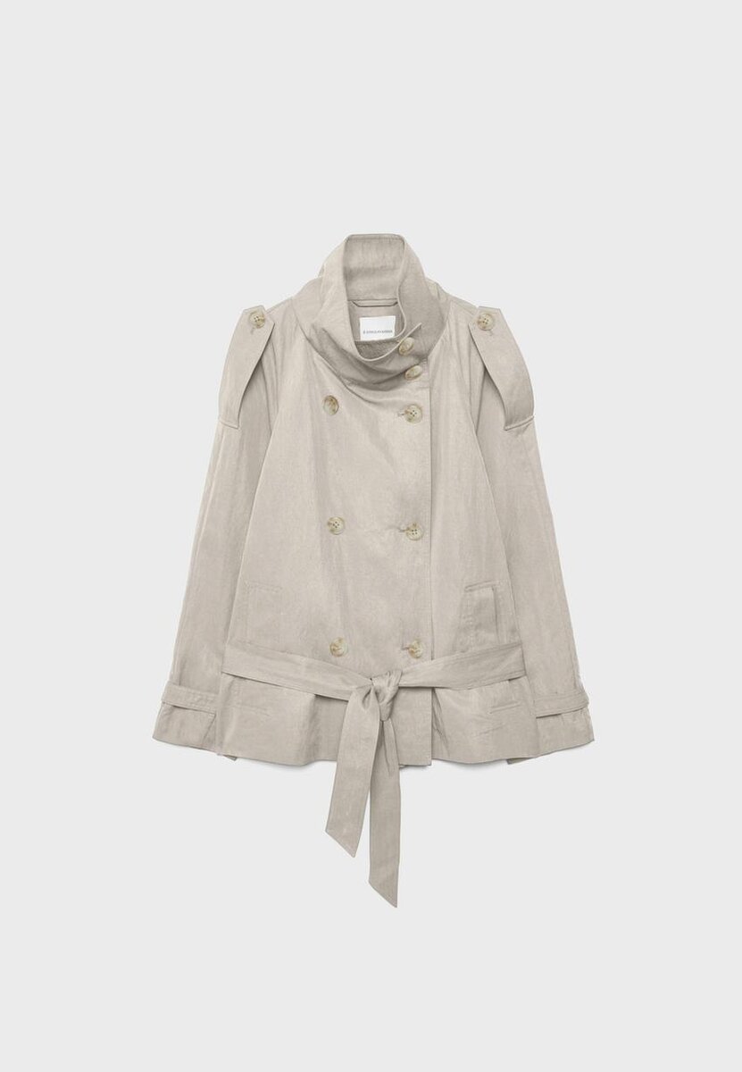 Trench corto a collo alto con maniche lunghe rifinito con linguetta e bottone. Tasche laterali. Chiusura frontale a doppio petto con bottoni e cintura abbinata. Disponibile in diversi colori.
