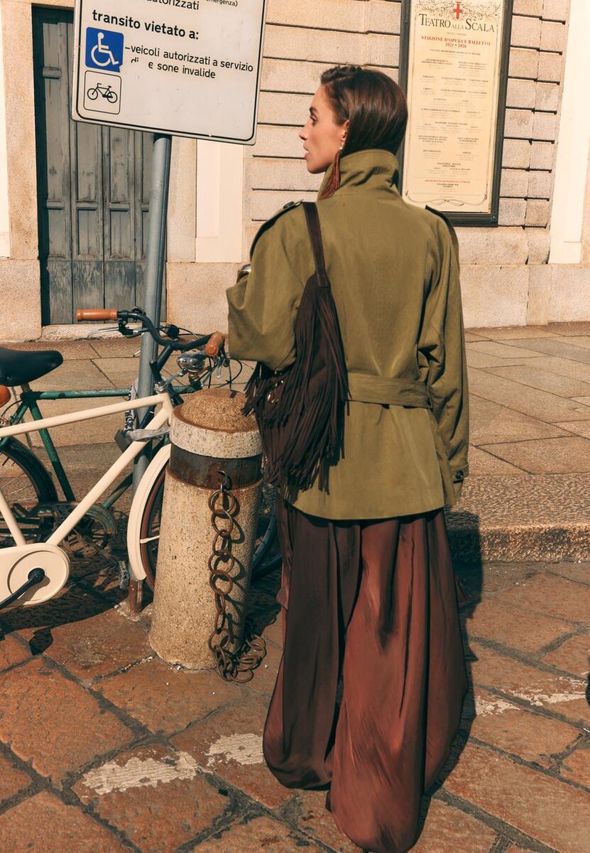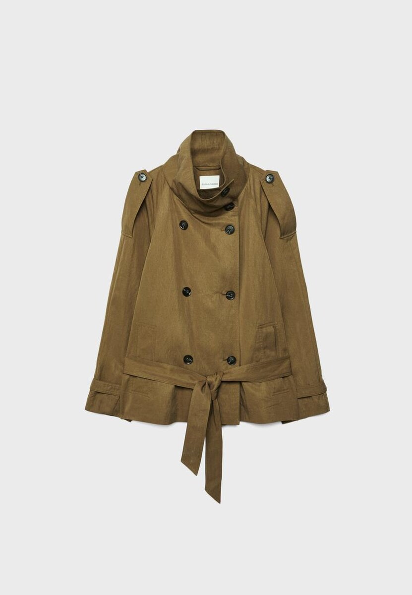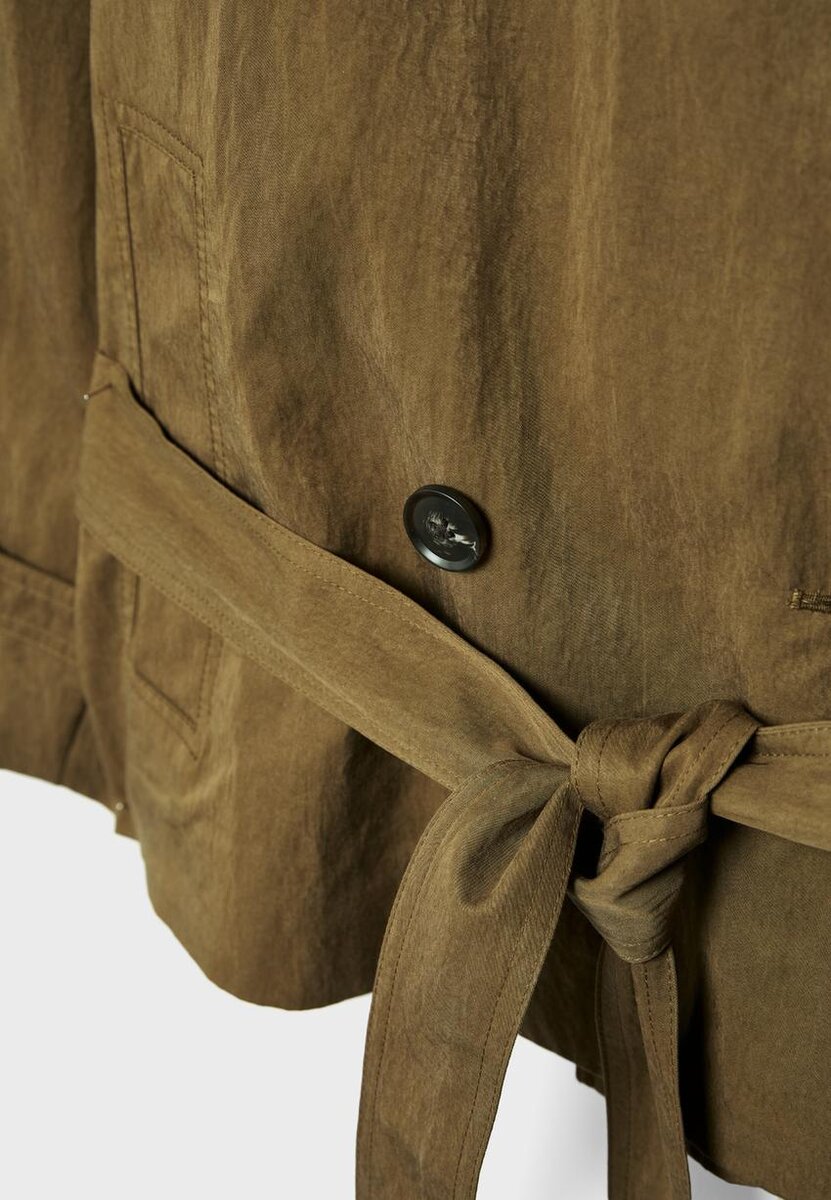 Trench corto fluido con collo a revers e maniche lunghe con linguetta e bottone. Tasche laterali. Chiusura frontale a doppio petto con bottoni e cintura da annodare.