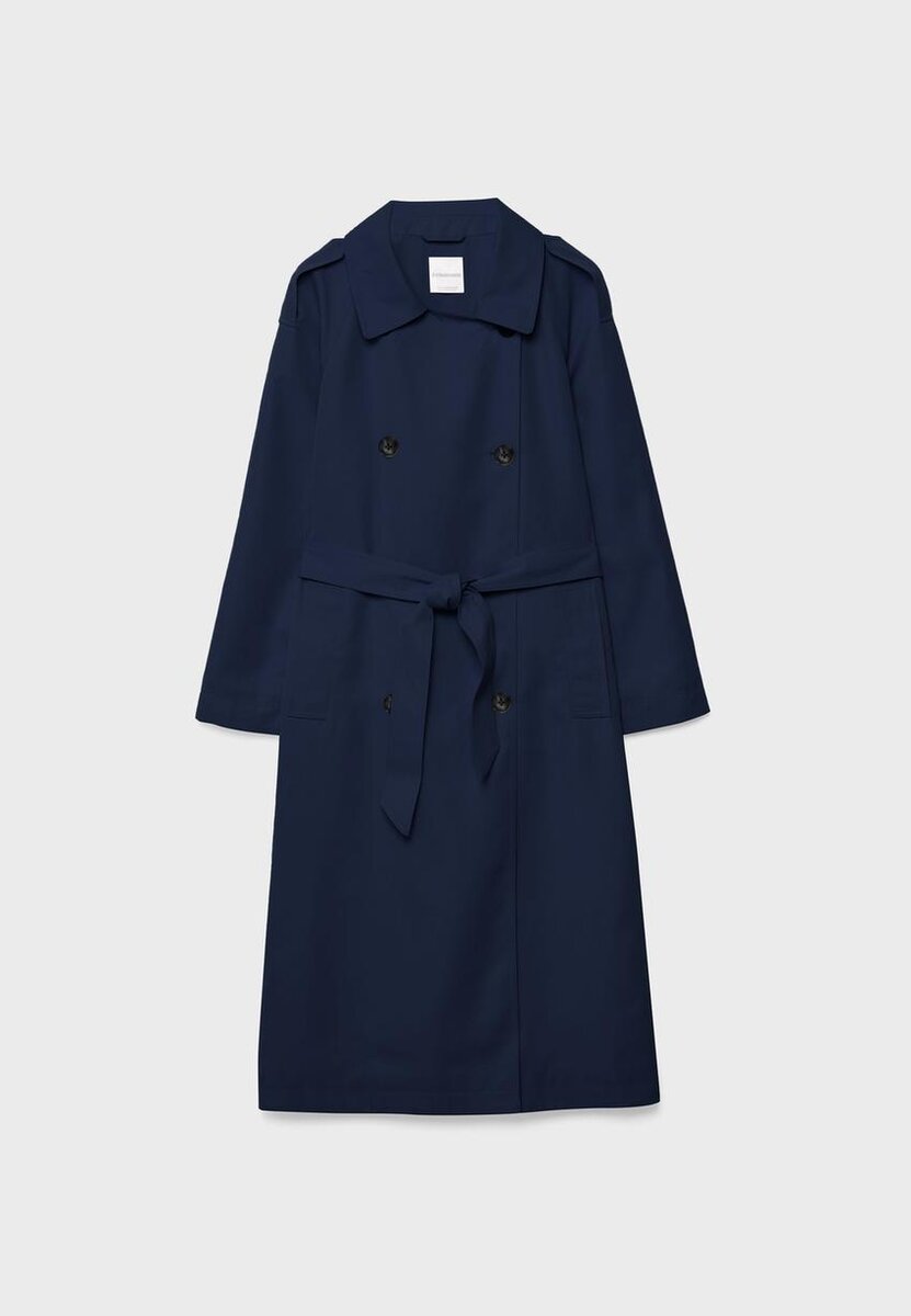 Trench lungo e fluido. Con collo a revers, maniche lunghe e tasche laterali. Chiusura a doppio petto con bottoni e cintura abbinata. Disponibile in vari colori.