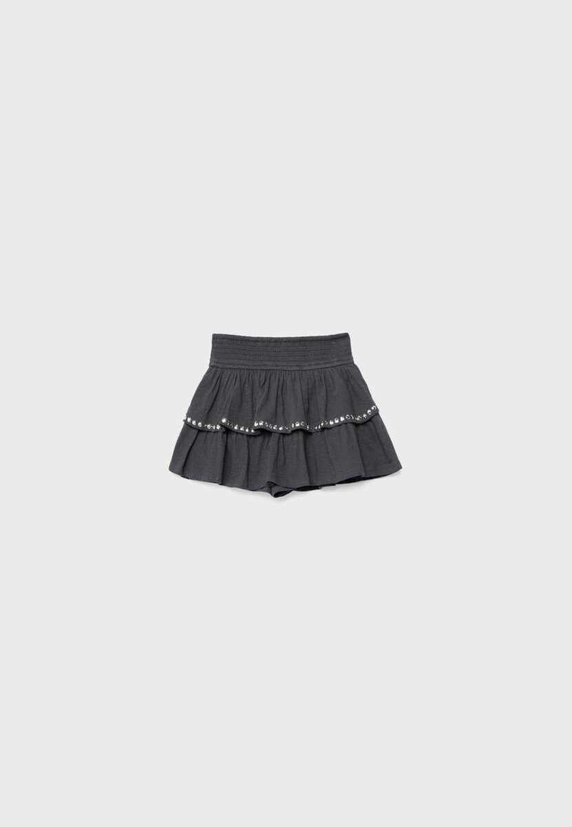 Minigonna con elastico in vita smockato. Caratterizzata da orlo con volant e dettagli con borchie. Pantaloncini interni abbinati. Disponibile in vari colori.