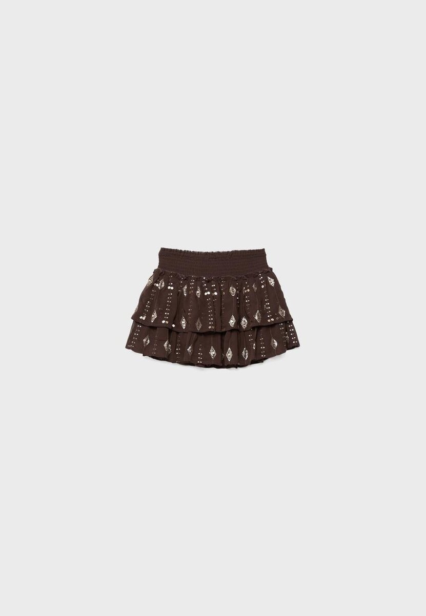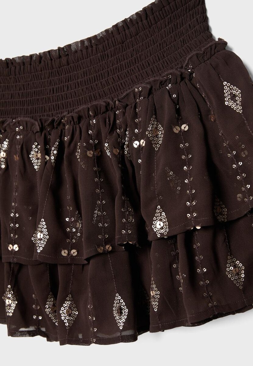 Minigonna con elastico smockato in vita. Caratterizzata da orlo arricciato e ricami con perline. Disponibile in vari colori.