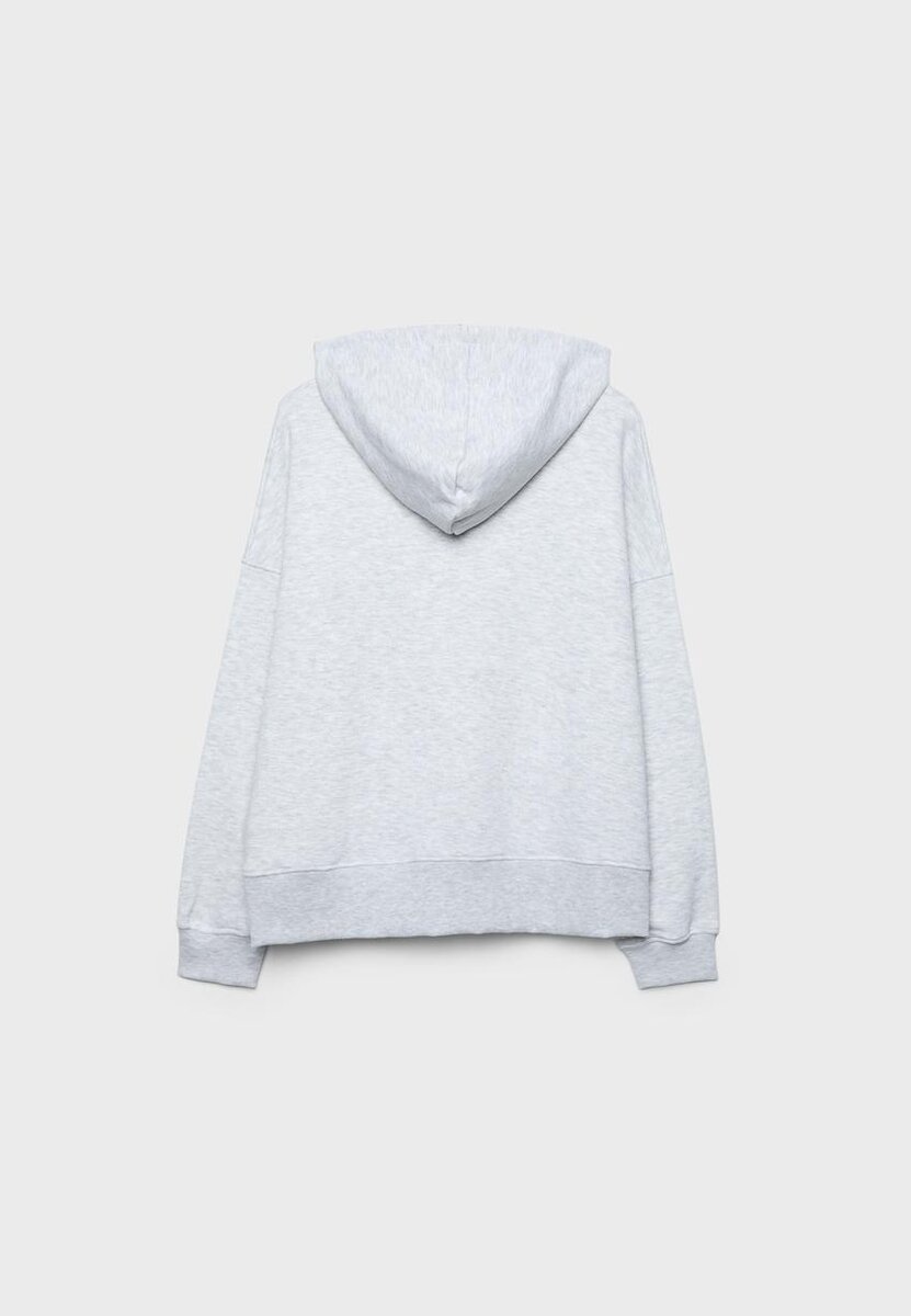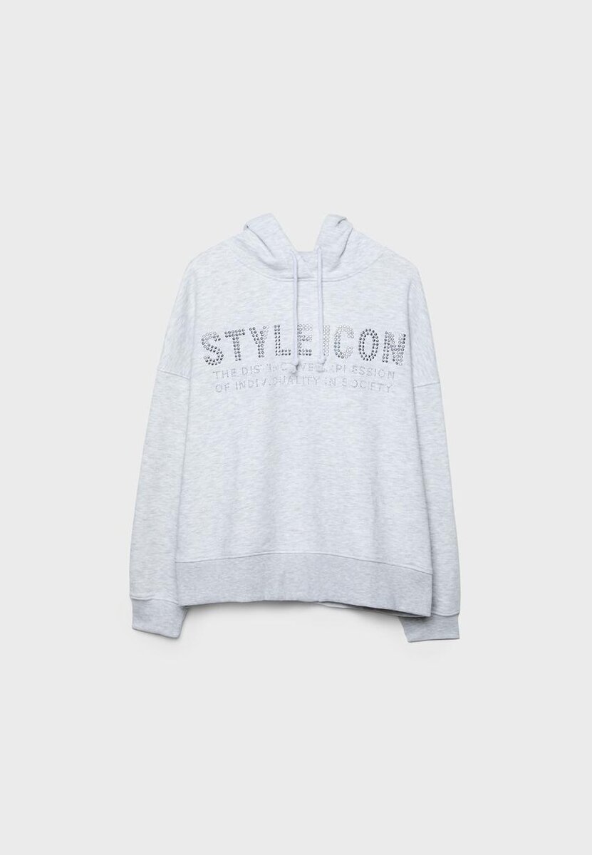 Felpa con cappuccio regolabile tramite coulisse. Maniche lunghe con polsini e orlo a costine. Presenta un dettaglio con stampa di strass sul davanti.