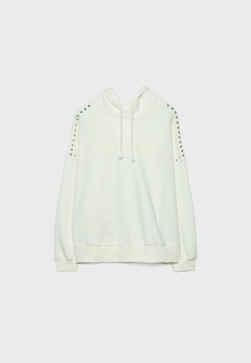 Felpa con cappuccio regolabile tramite coulisse. Maniche lunghe. Bordi a costine. Dettagli con borchie sulle spalle e ricami sul davanti.
