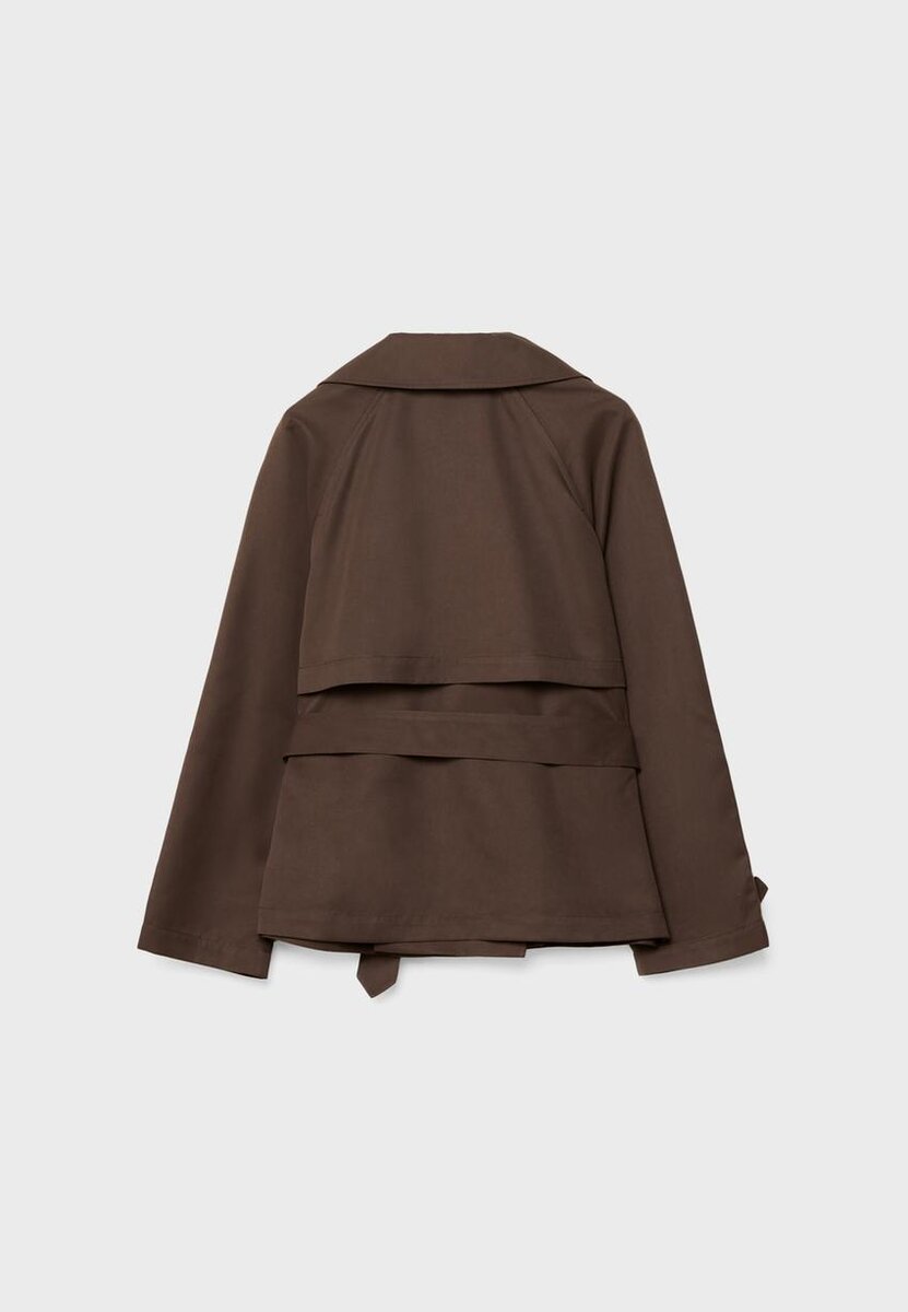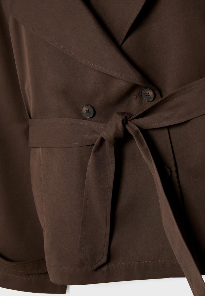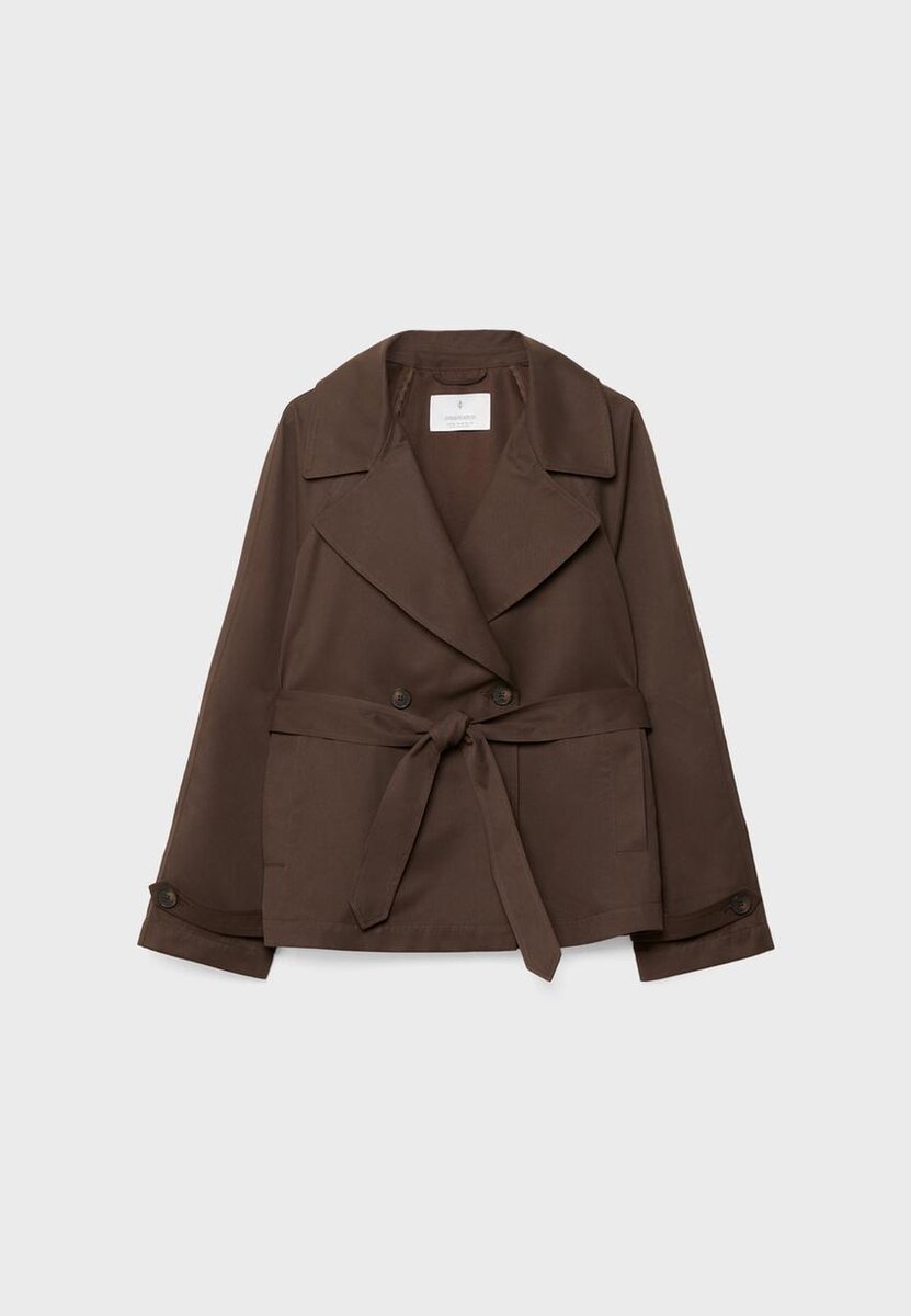 Trench corto e fluido con collo a revers e maniche lunghe con linguette abbottonate. Tasche laterali e chiusura a doppio petto con bottoni sul davanti. Disponibile in diversi colori.