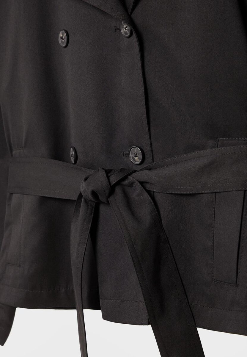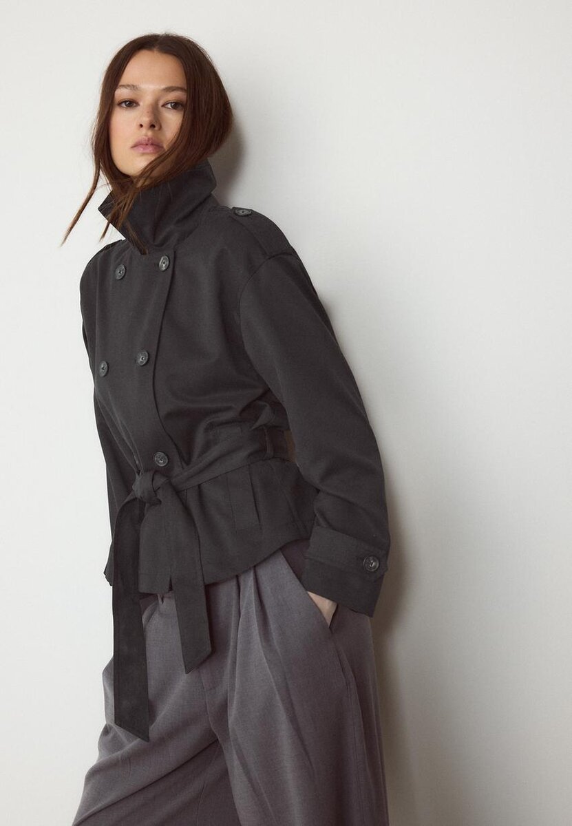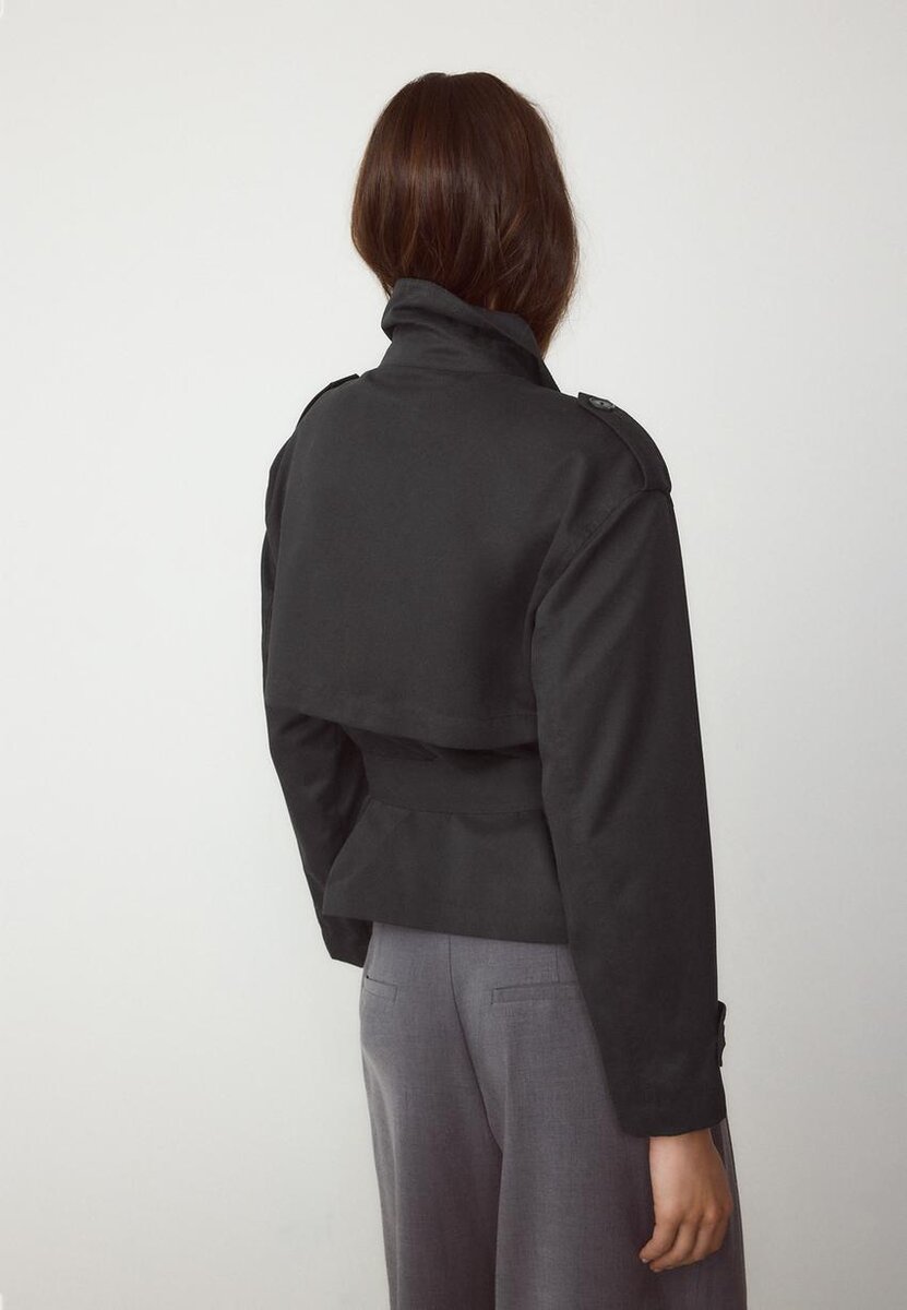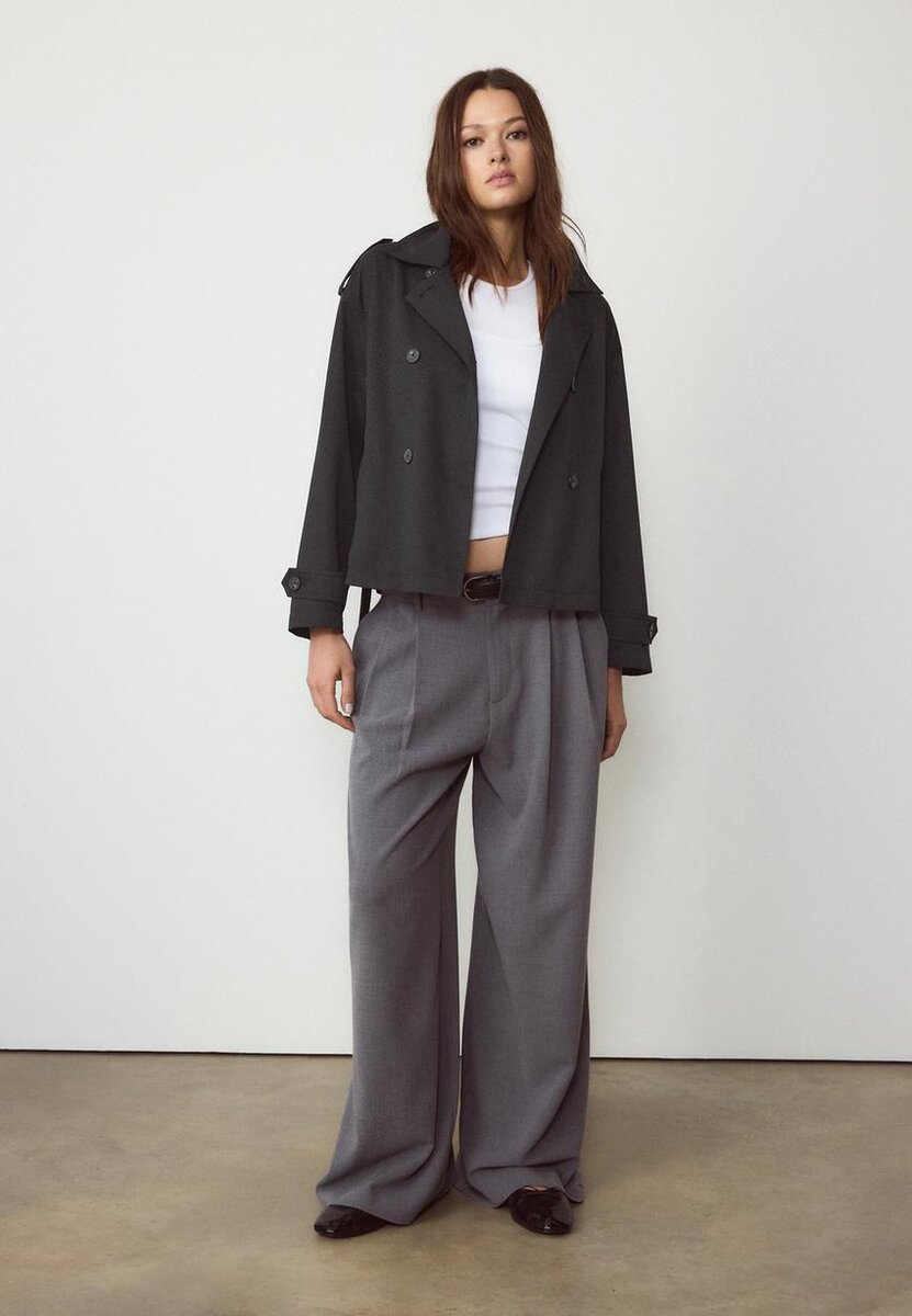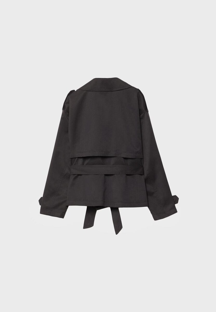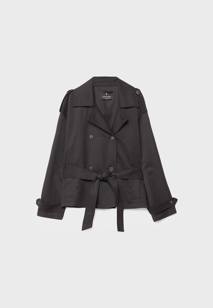 Cappotto corto e fluido con collo a revers e maniche lunghe con linguette abbottonate. Tasche laterali e chiusura frontale a doppio petto con bottoni. Disponibile in diversi colori.