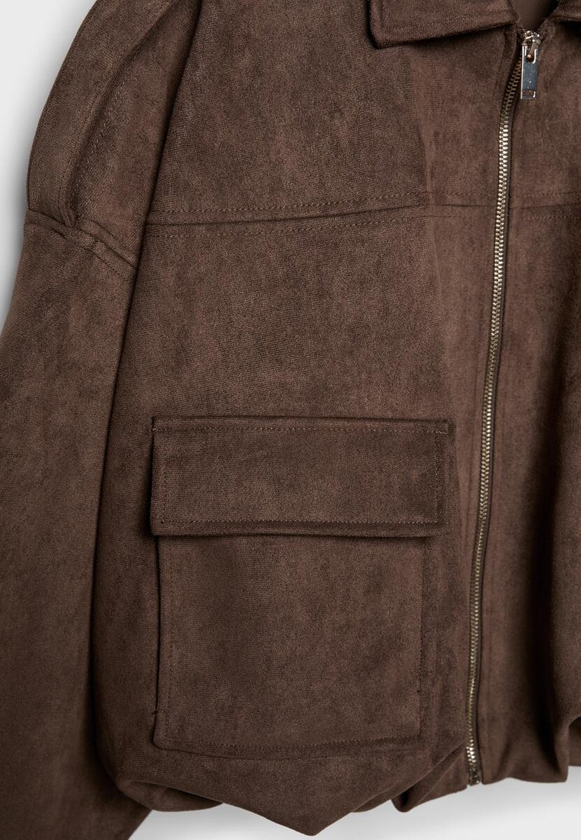 Giacca realizzata in tessuto ecopelle scamosciata. Stile bomber con collo a revers. Maniche lunghe e orlo elasticizzato. Tasche applicate sul davanti. Chiusura frontale con zip. Dettaglio linguetta sulle spalle. Disponibile in vari colori.