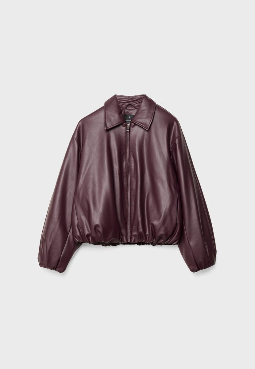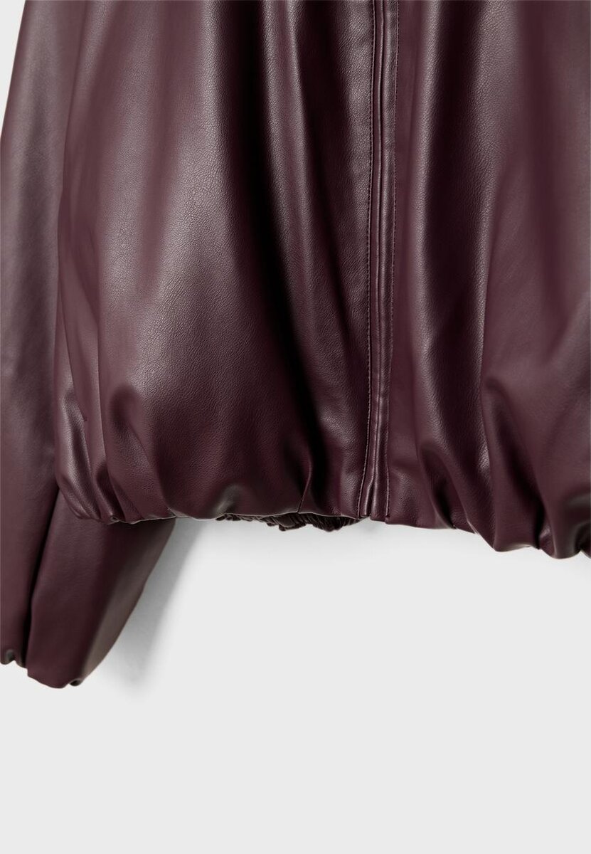Giacca bomber trapuntata in tessuto effetto pelle. Collo a revers e maniche lunghe con polsini elasticizzati. Tasche laterali. Orlo arricciato con elastico. Chiusura frontale con cerniera in metallo.