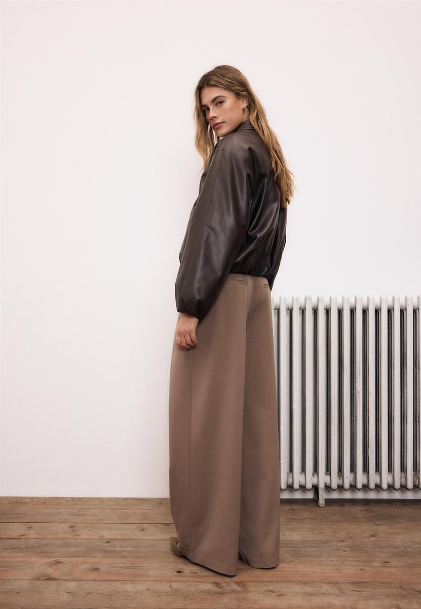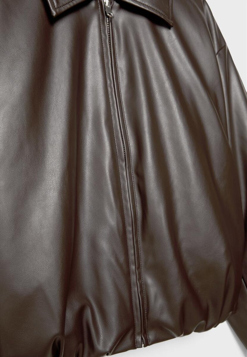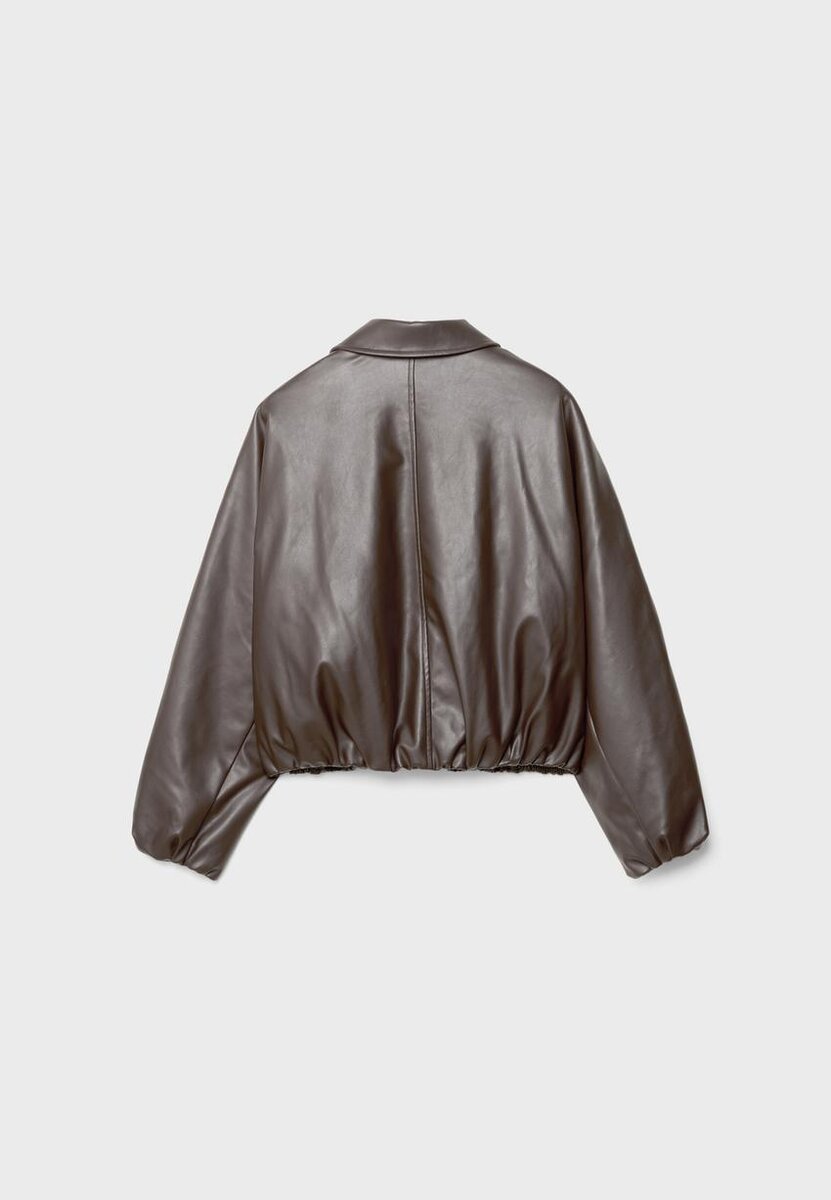 Giacca bomber trapuntata in tessuto effetto pelle. Collo a revers e maniche lunghe con polsini elasticizzati. Tasche laterali. Orlo arricciato con elastico. Chiusura frontale con cerniera in metallo.