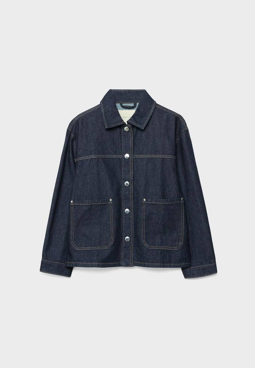Giacca in denim con colletto, maniche lunghe e polsini abbottonati. Tasche applicate sul davanti. Chiusura frontale con bottoni a pressione in metallo.