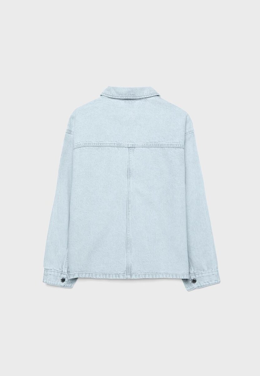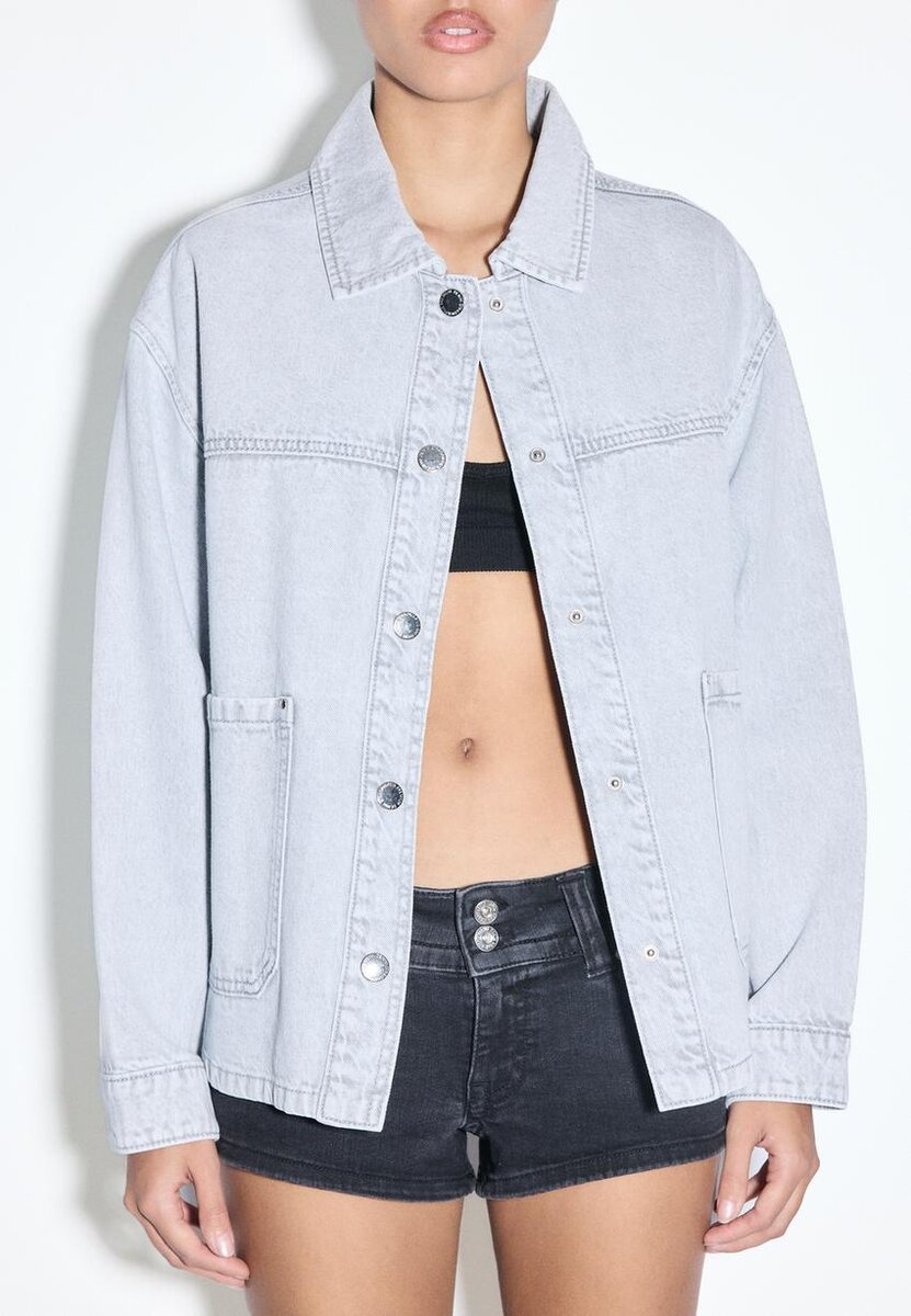 Giacca in denim con colletto, maniche lunghe e polsini abbottonati. Tasche applicate sul davanti. Chiusura frontale con bottoni a pressione in metallo.