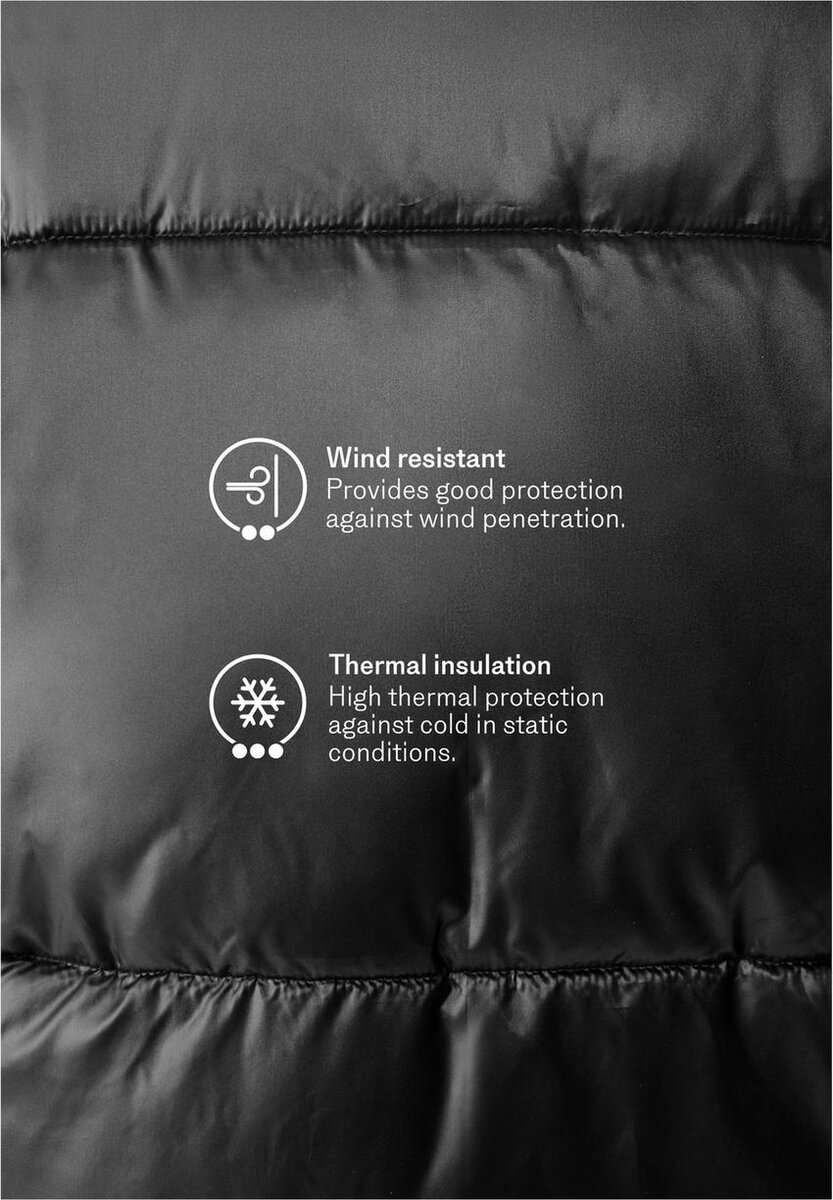 Piumino effetto metallizzato con collo alto e cappuccio regolabile con coulisse. Caratterizzata da maniche lunghe con fori per il pollice in stile guanto sui polsini, tasche anteriori, una tasca interna con cerniera, cinghie interne per appenderla sulla schiena e chiusura frontale con cerniera.