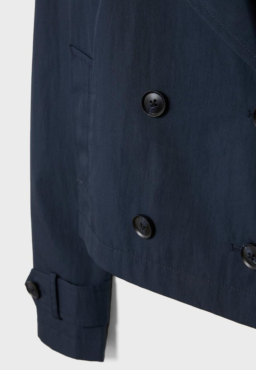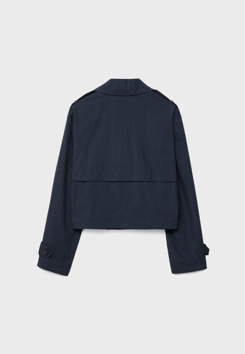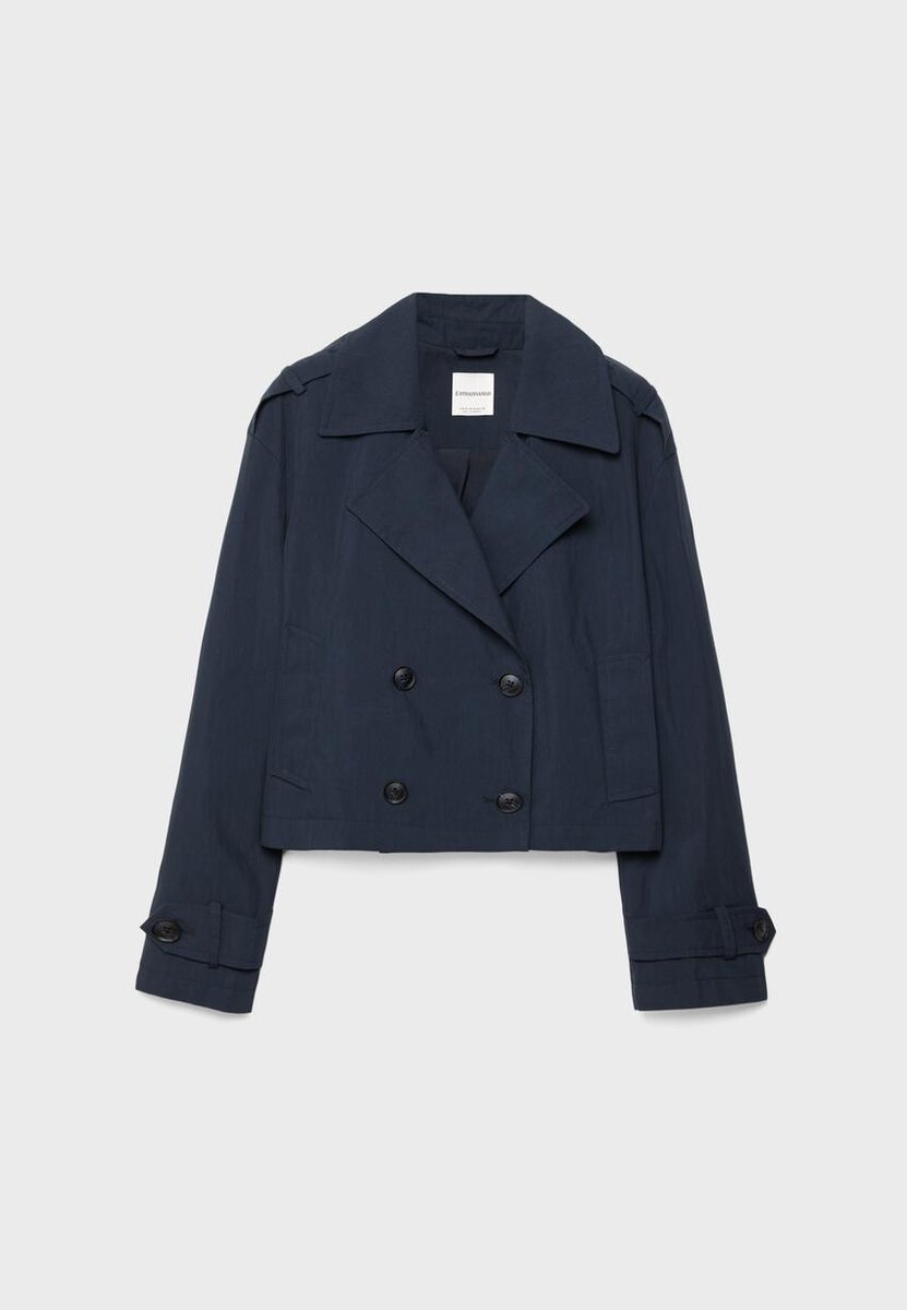 Trench corto con collo a revers e maniche lunghe con linguette e chiusura a bottoni. Tasche laterali. Chiusura a doppio petto con bottoni sul davanti. Disponibile in vari colori.