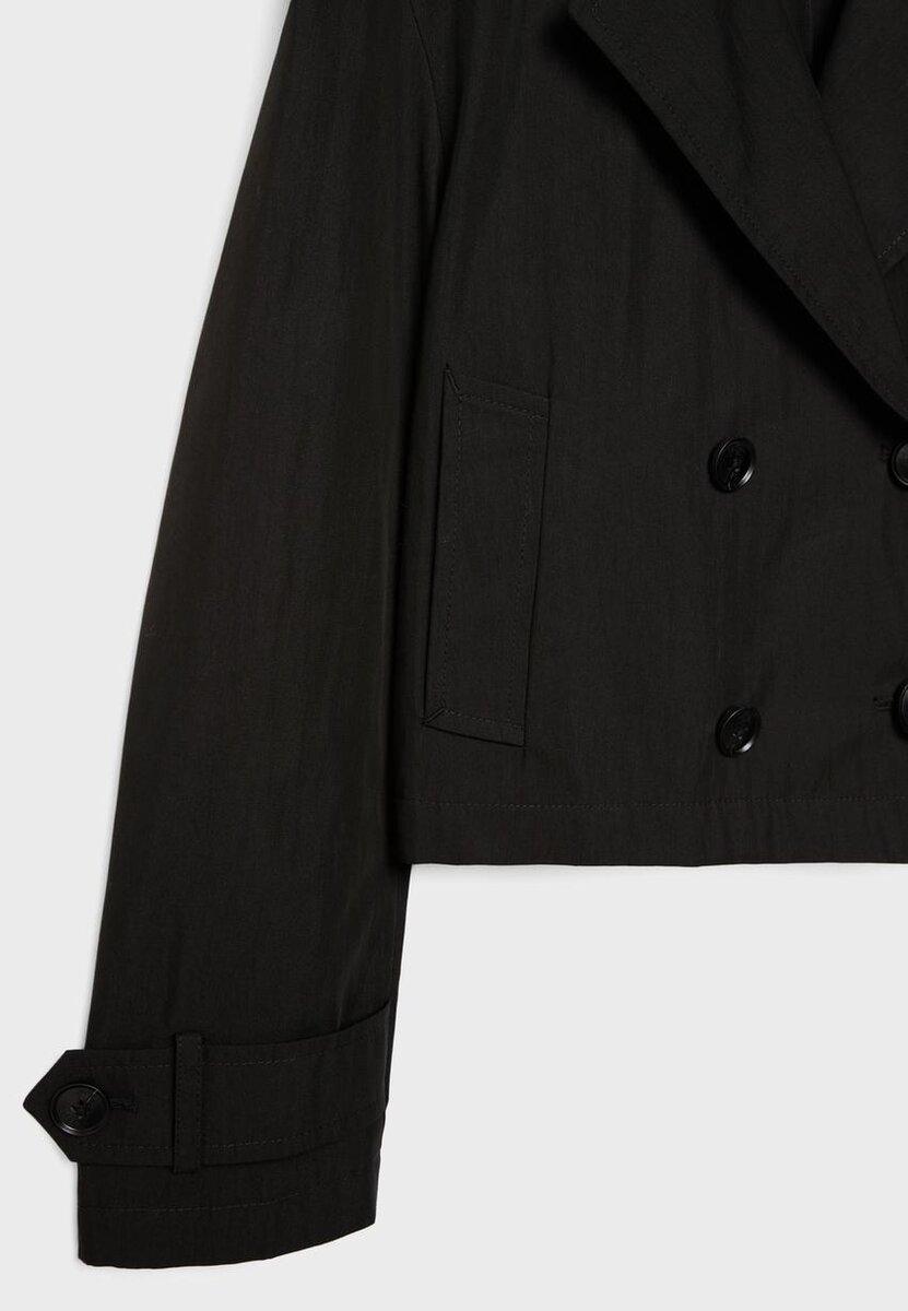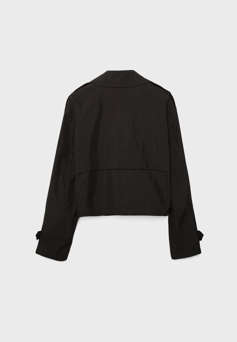 Trench corto con collo a revers e maniche lunghe con linguetta e bottone. Tasche laterali. Chiusura a doppio petto con bottoni sul davanti. Disponibile in diversi colori.