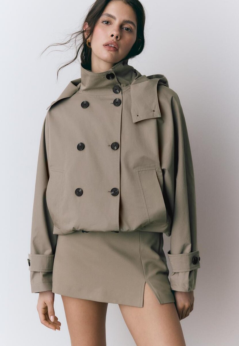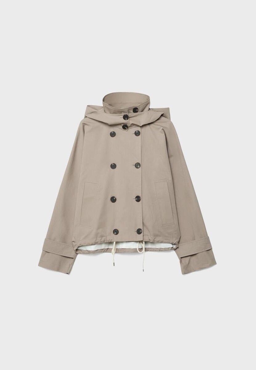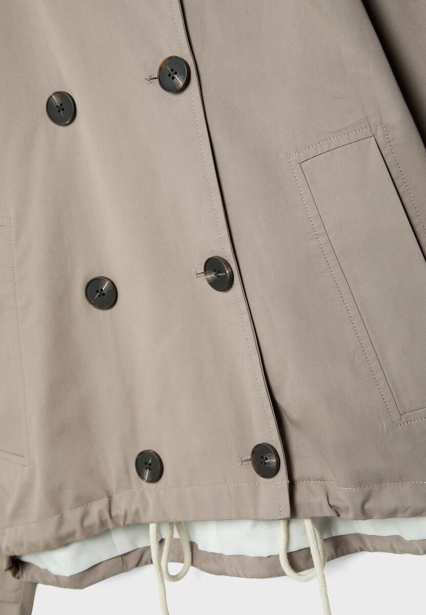 Trench corto con collo alto e maniche lunghe. Orlo a palloncino regolabile. Chiusura frontale con bottoni. Caratterizzato da dettagli a linguetta sulle maniche e cappuccio staccabile.