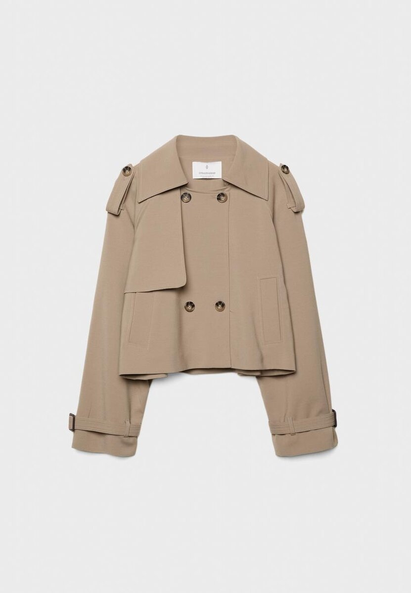 Trench corto e fluido con collo a revers e maniche lunghe con dettagli a linguetta. Tasche a filetto sui lati. Chiusura frontale a doppio petto con bottoni.