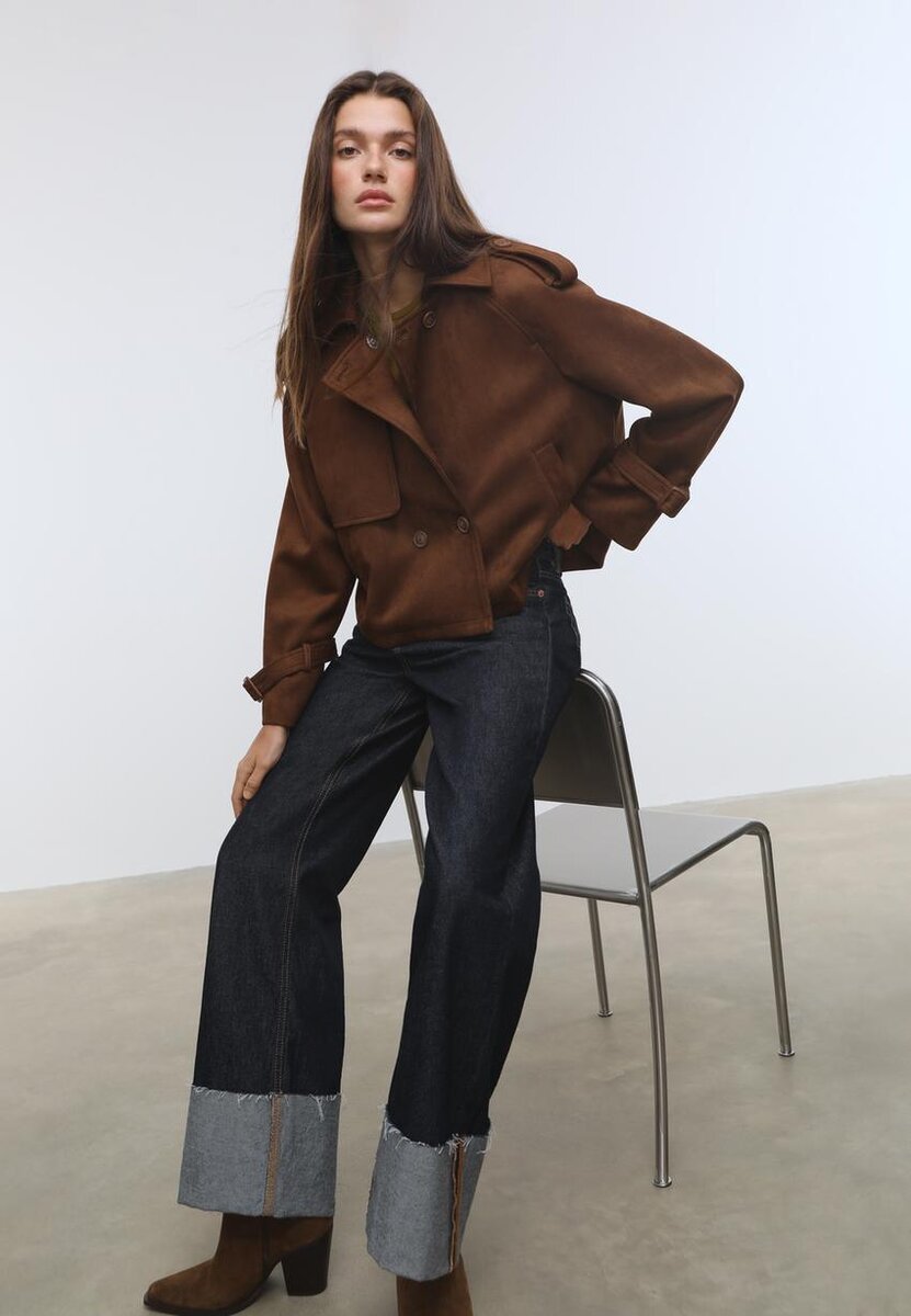 Trench corto e fluido con collo a revers e maniche lunghe con linguette. Dotato di tasche a filetto laterali, chiusura a doppio petto con bottoni sul davanti e dettagli in ecopelle scamosciata.