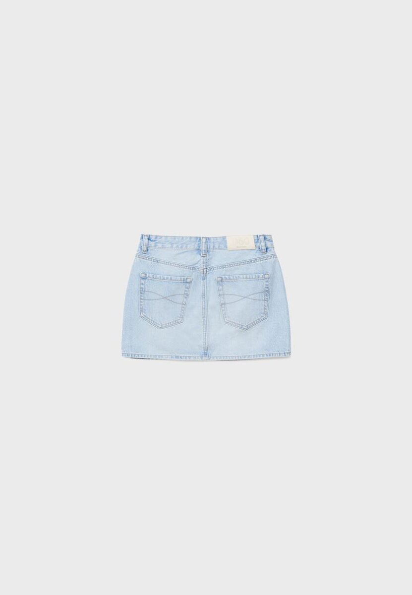 Minigonna in denim a vita media. Caratterizzata da design a cinque tasche e passanti per cintura. Chiusura frontale con zip e bottoni. Disponibile in diversi colori.