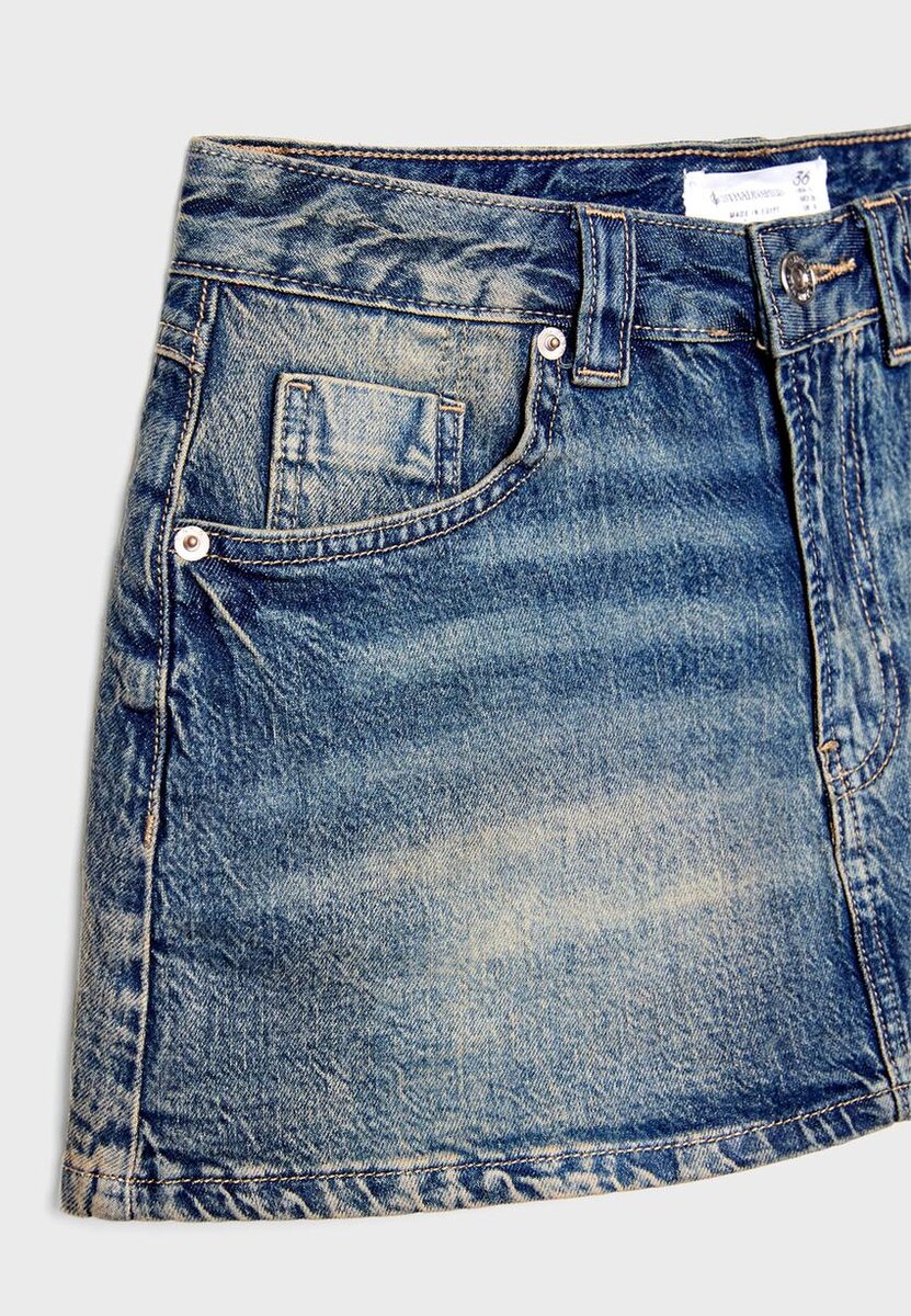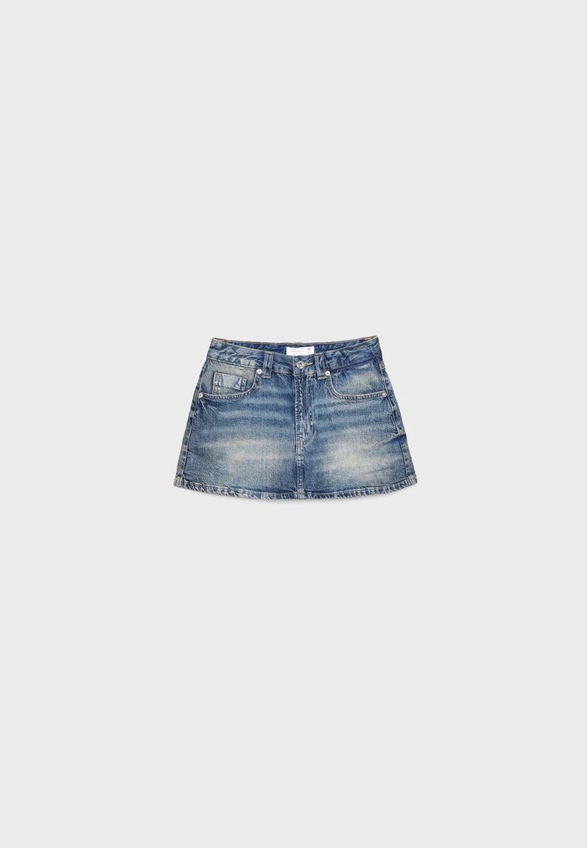Mini Skort in denim a vita media con passanti per cintura. Tasche anteriori e tasche applicate posteriori. Chiusura frontale con zip e bottoni in metallo.