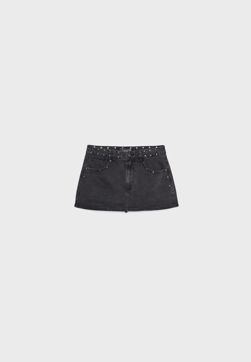 Skort mini in denim a vita media con passanti per cintura. Dotata di tasche anteriori, tasche applicate posteriori, borchie in metallo applicate e chiusura frontale con zip e bottone in metallo.