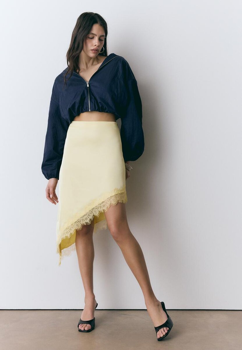 Gonna midi a vita media realizzata in tessuto effetto raso. Orlo asimmetrico con bordino in pizzo. Disponibile in diversi colori.