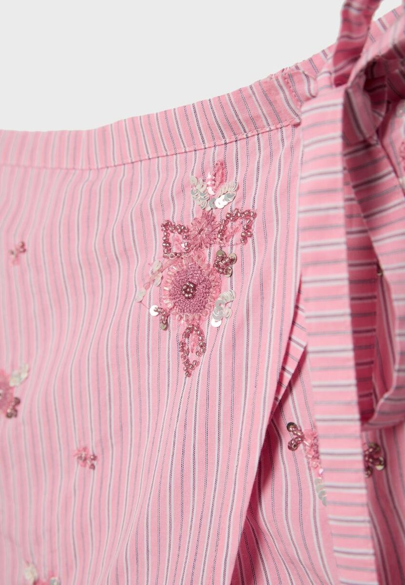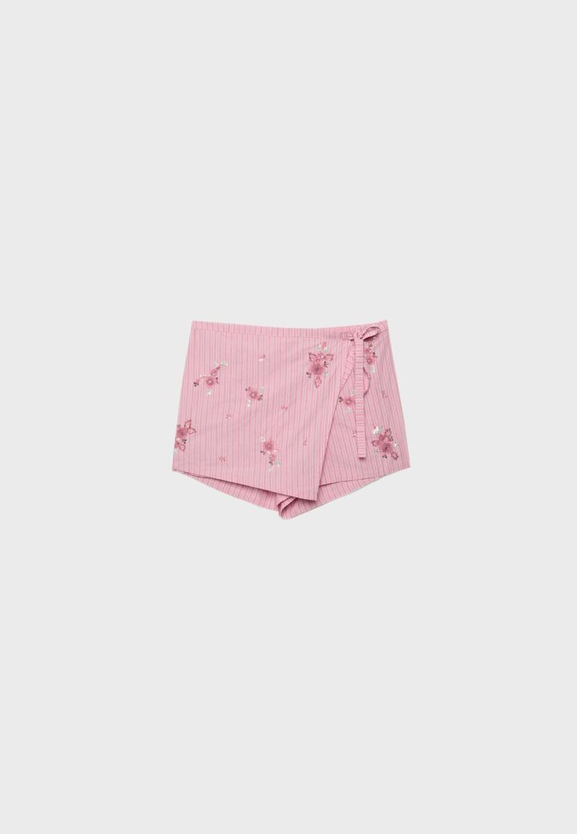 Mini Skort a vita alta con design a pareo incrociato, realizzata in tessuto di cotone a righe. Presenta ricami floreali su tutta la superficie. Chiusura con lacci laterali.