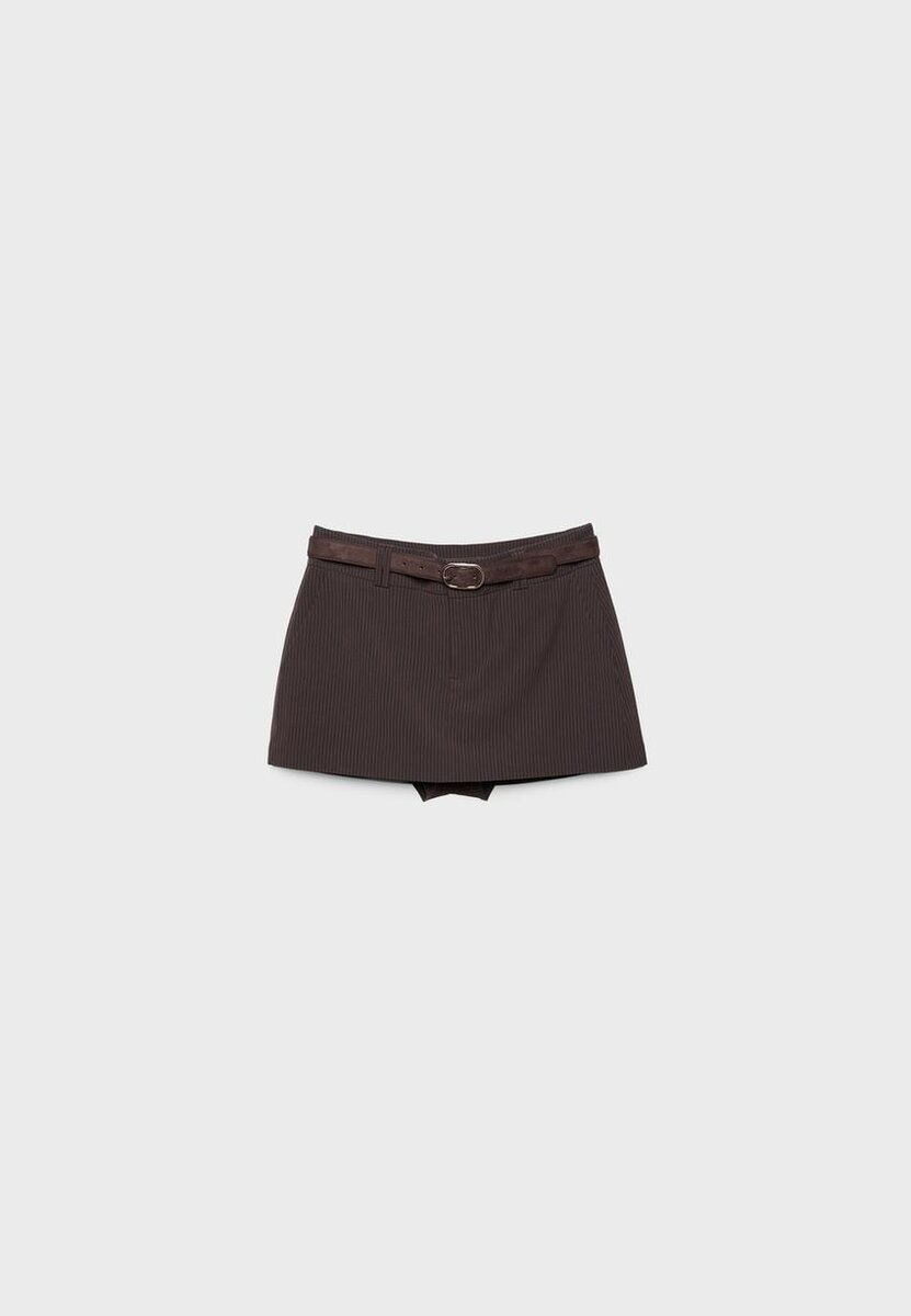 Skort a vita media con passanti per cintura. Cintura a contrasto rimovibile con fibbia in metallo. Chiusura laterale con cerniera nascosta nella cucitura. Foderata con pantaloncini interni. Disponibile in vari colori.