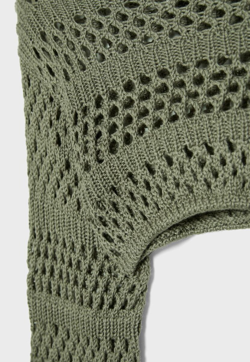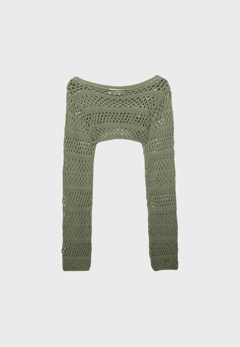 Bolero realizzato in maglia traforata con cotone. Gola rotonda e maniche lunghe. Modello corto con orlo arrotondato. Disponibile in diversi colori.