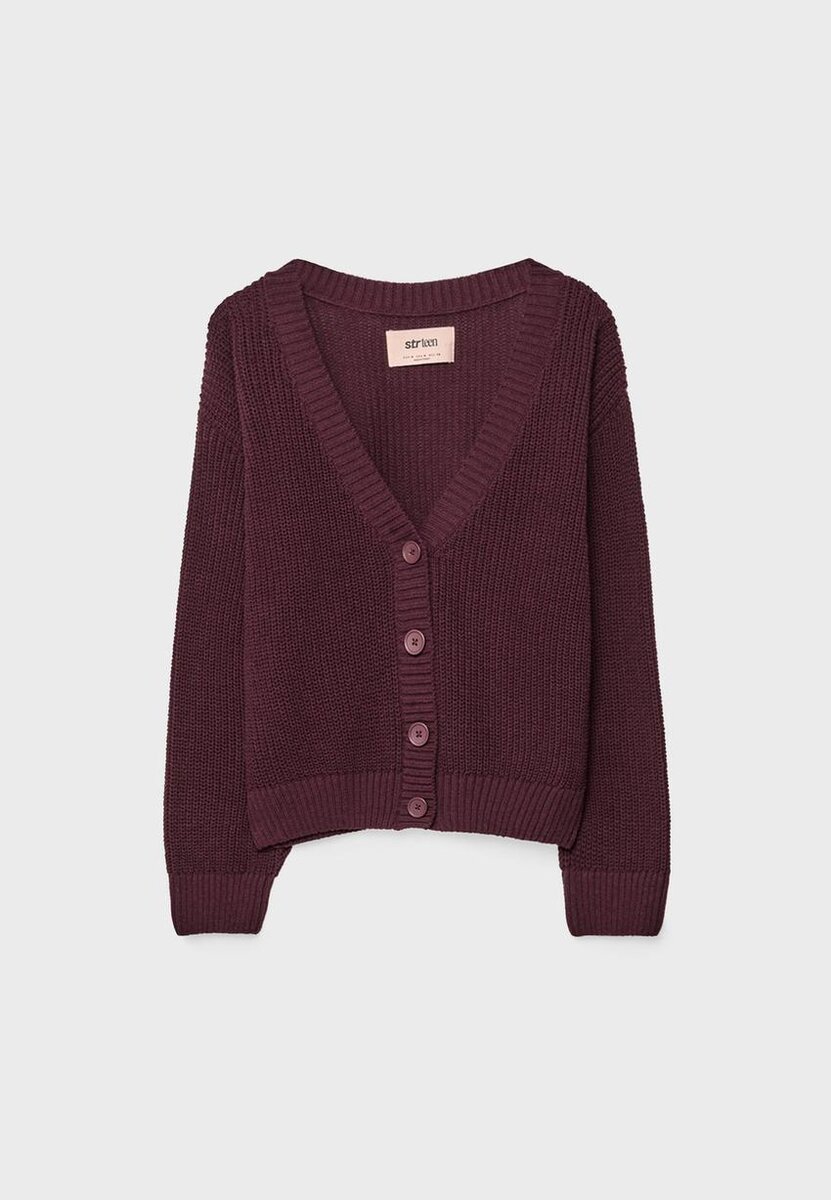 Cardigan in maglia con scollo a V, maniche lunghe, bordi a costine e chiusura frontale con bottoni in tinta. Disponibile in diversi colori.
