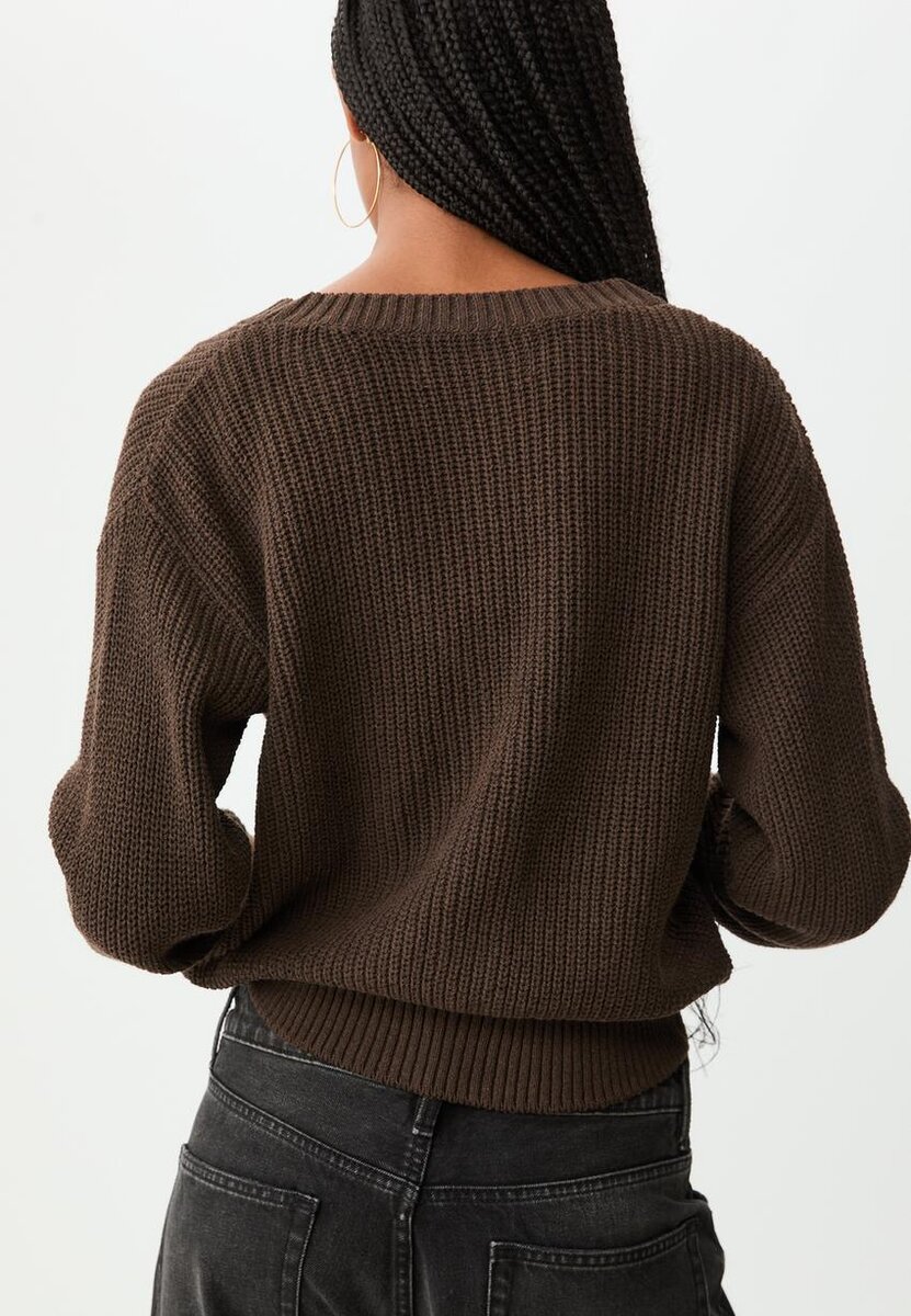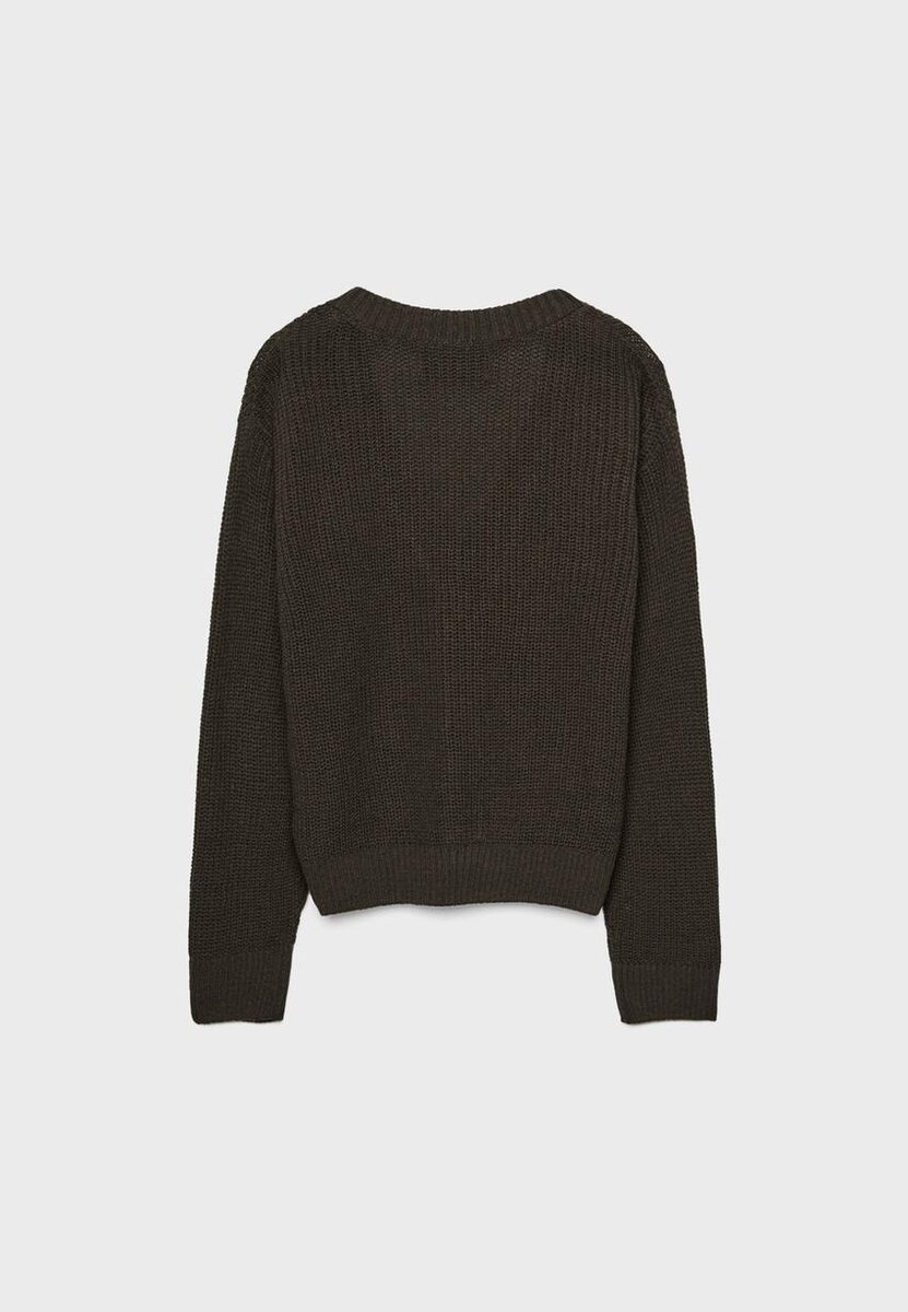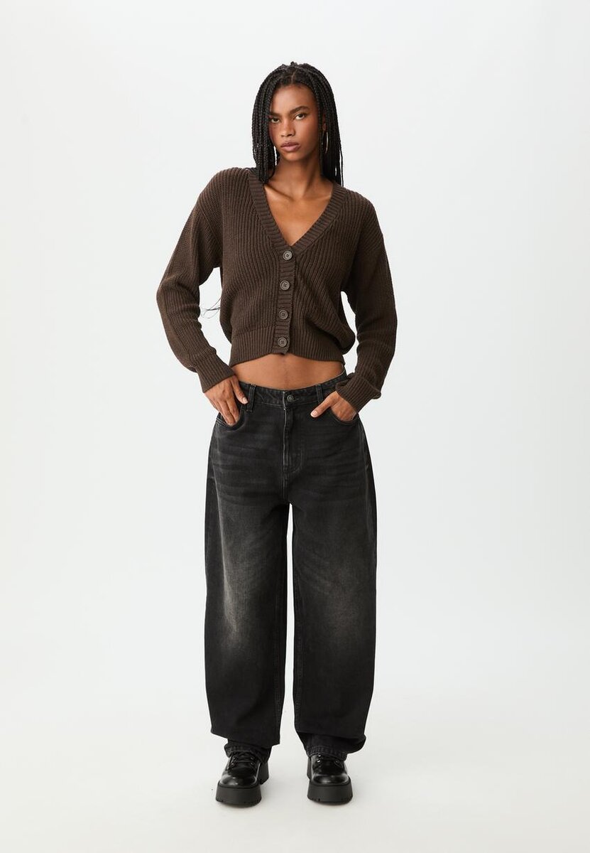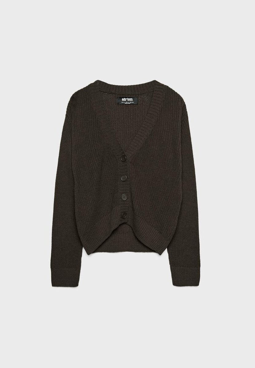 Cardigan in maglia con scollo a V, maniche lunghe, bordi a costine e chiusura frontale con bottoni in tinta. Disponibile in diversi colori.