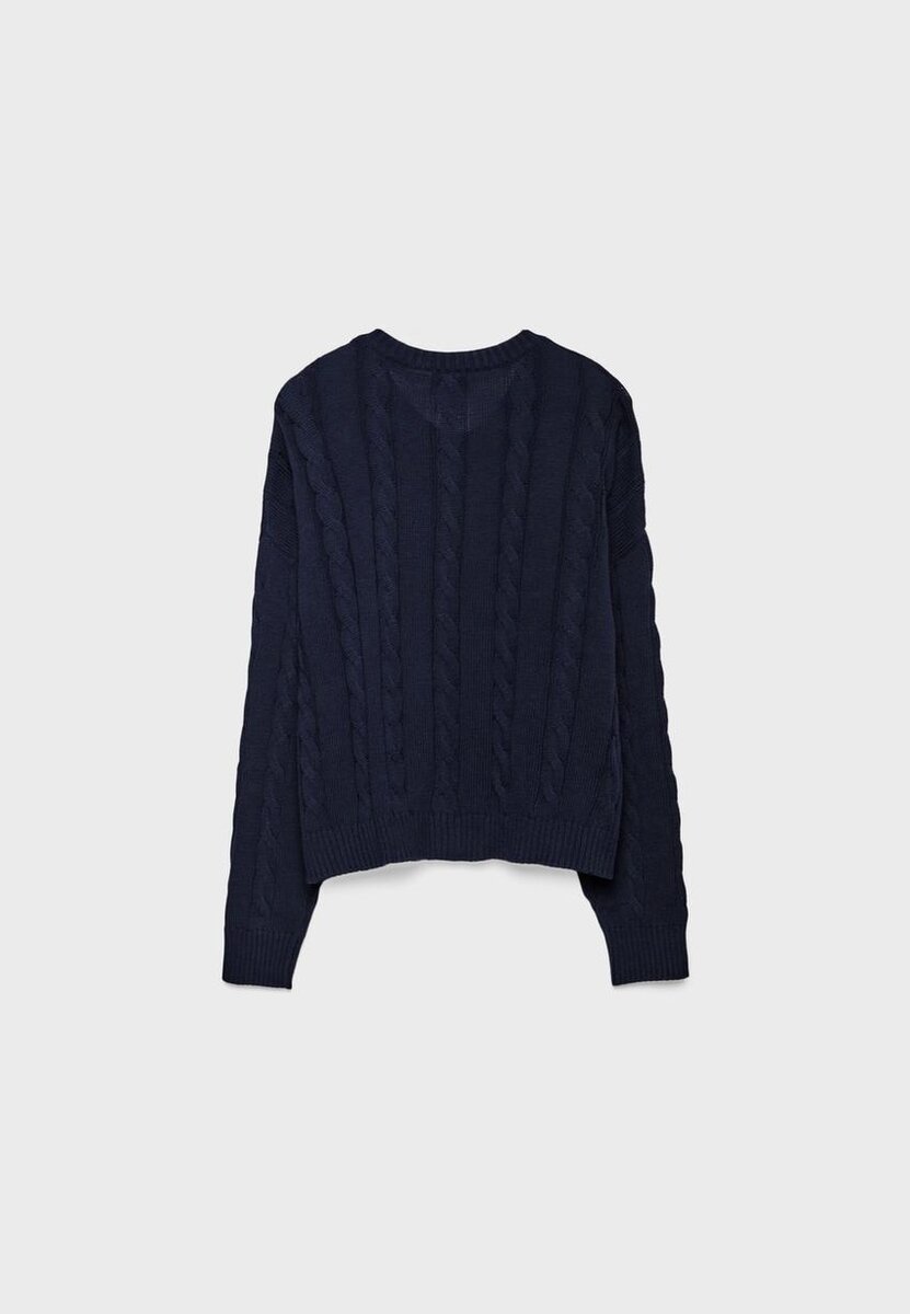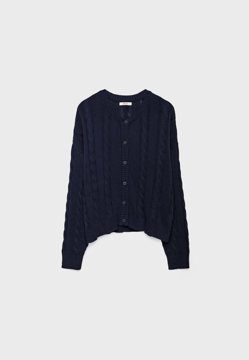 Cardigan con lavorazione a trecce, collo rotondo e maniche lunghe. Chiusura frontale con bottoni. Disponibile in diversi colori.
