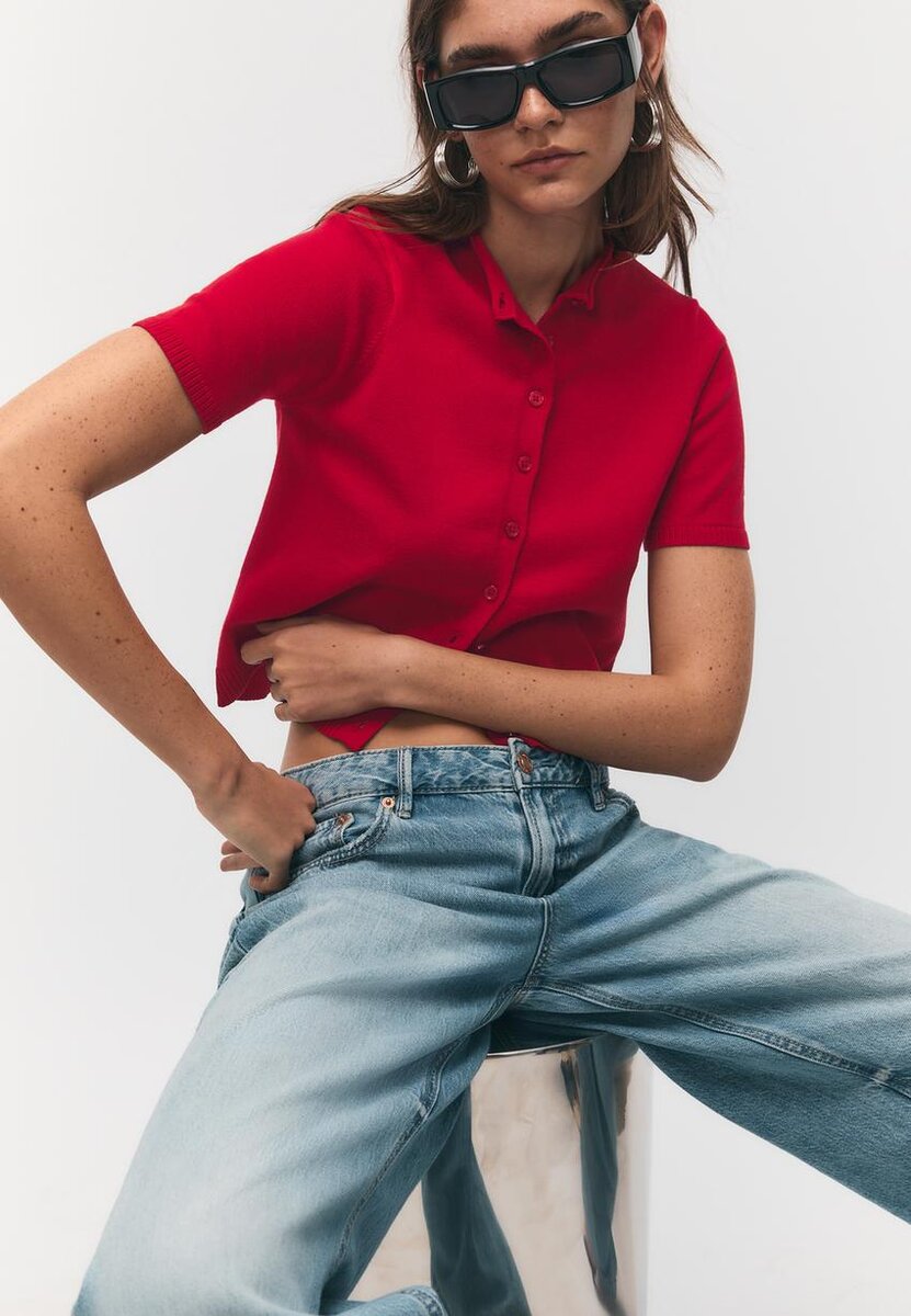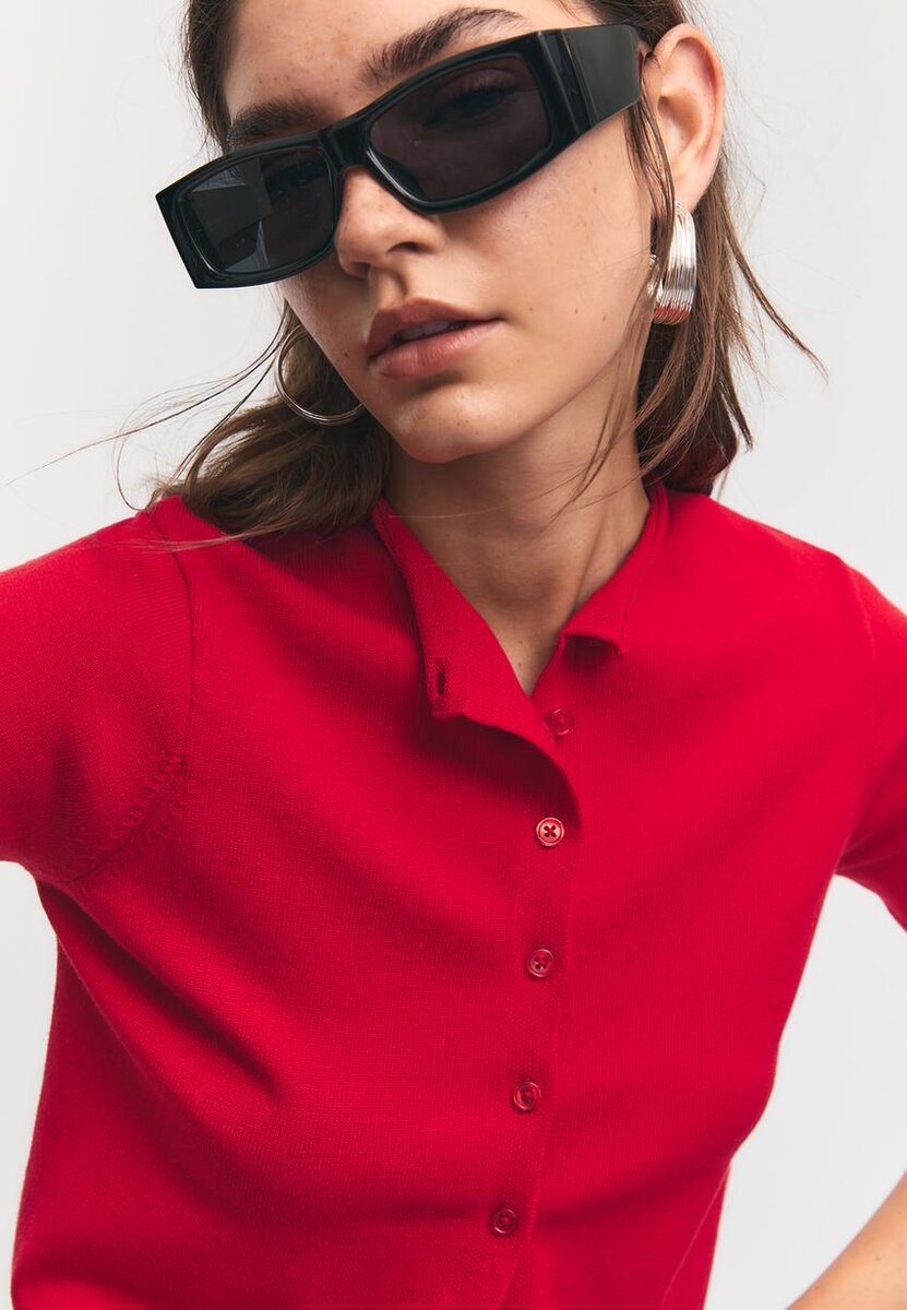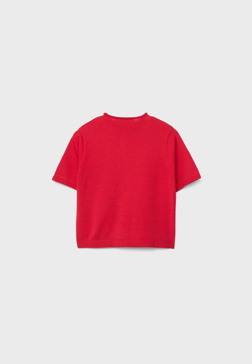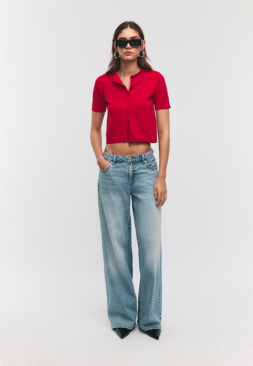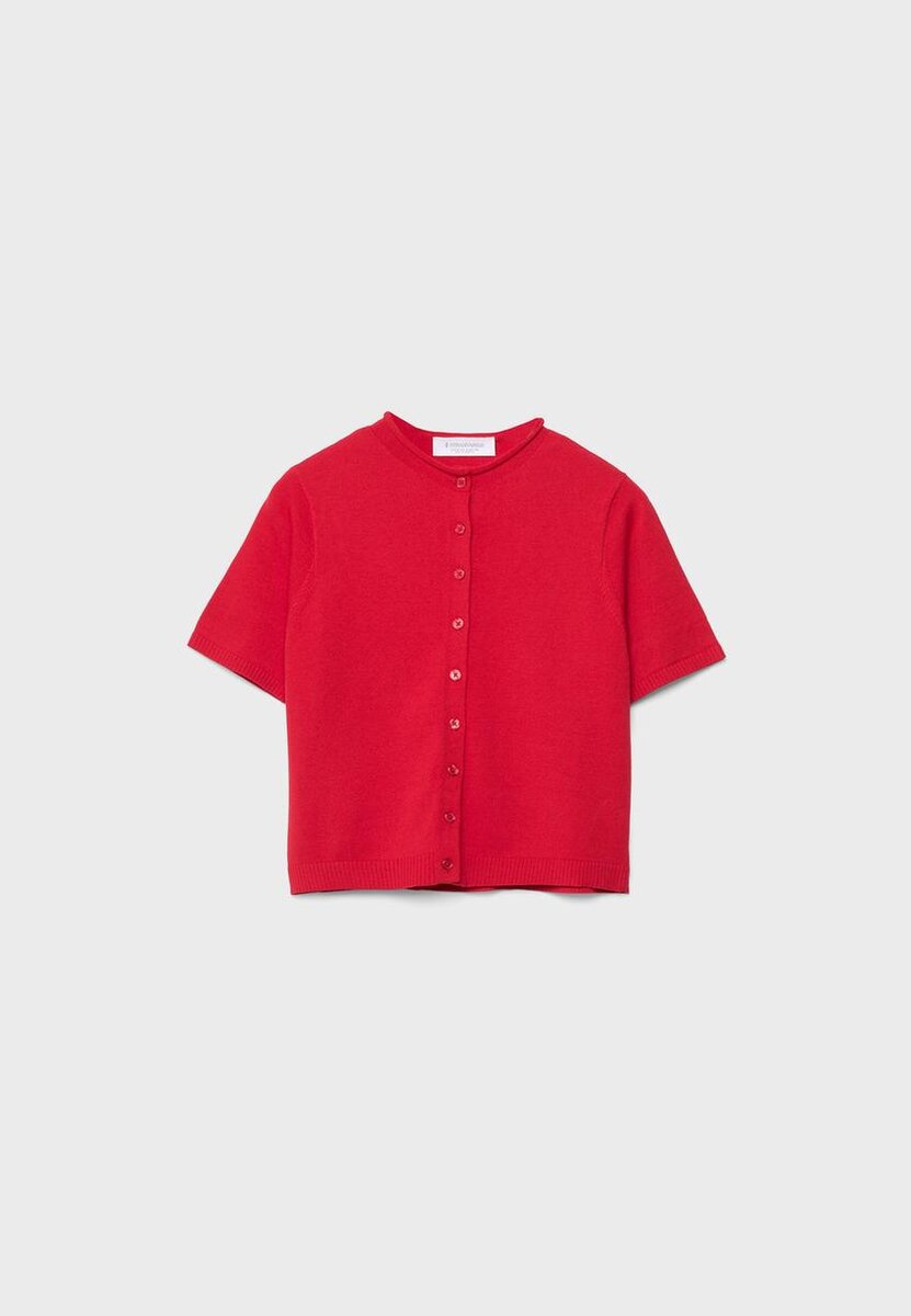 Cardigan in maglia con colletto alto e maniche corte. Chiusura frontale con bottoni in tinta. Bordi a costine sulle maniche e sull’orlo. Disponibile in diversi colori.