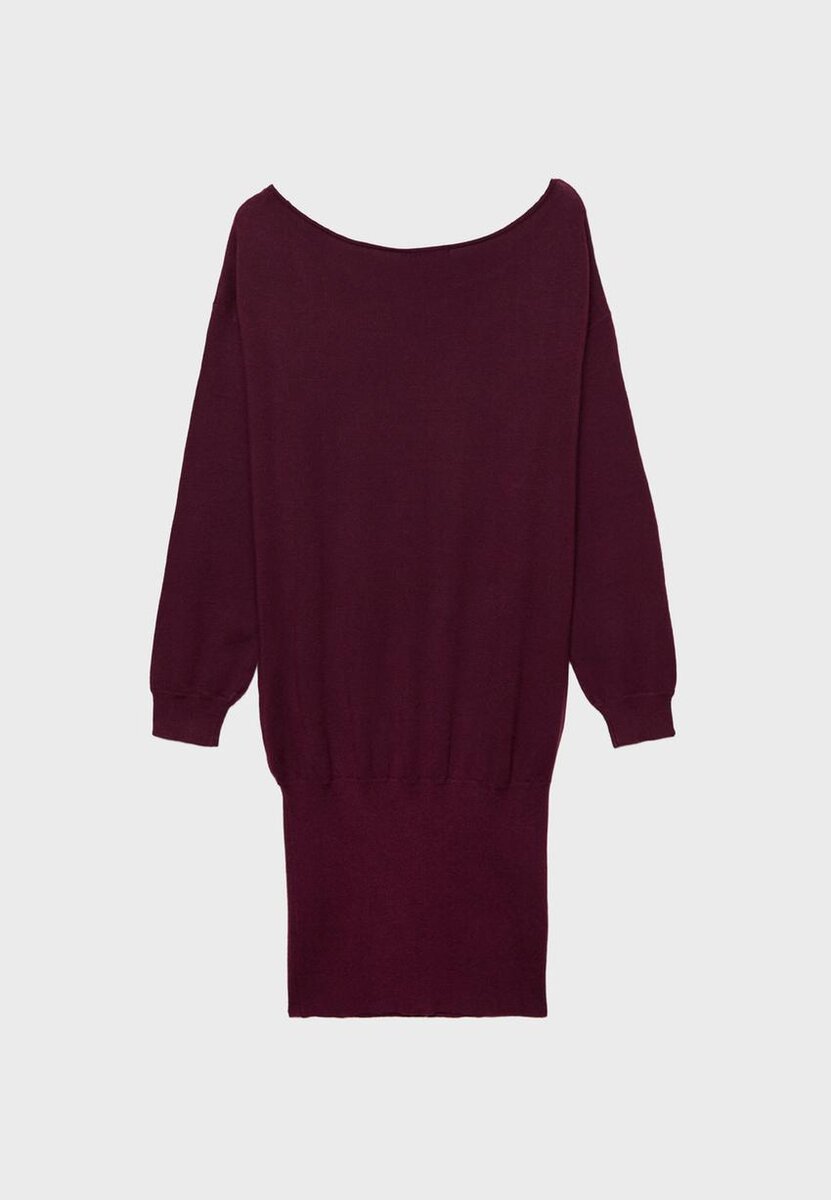 Vestito corto in maglia a tinta unita con silhouette ampia e orlo aderente. Scollo a barchetta e maniche lunghe con polsini elasticizzati. Disponibile in diversi colori.