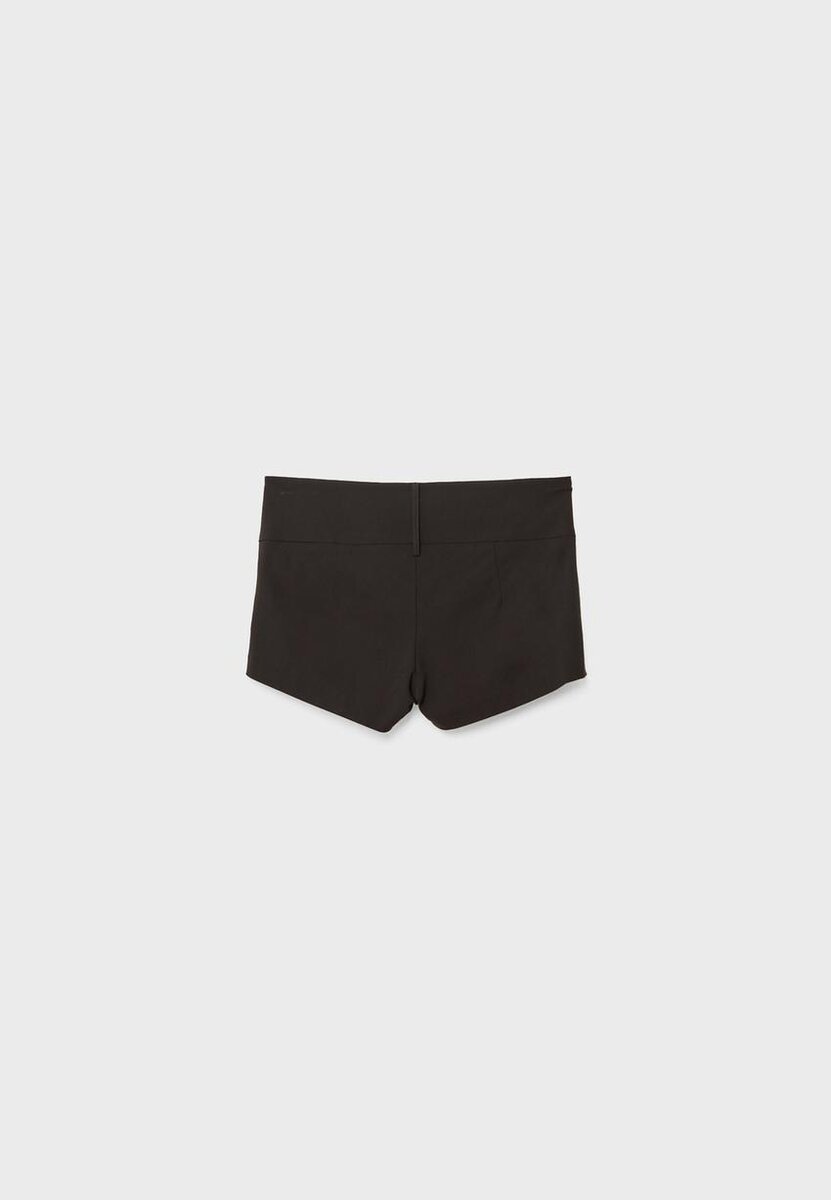 Pantaloncini a vita media con ampia fascia in vita e passanti per cintura. Gamba aderente. Chiusura frontale con zip, bottone nascosto e gancio in metallo.