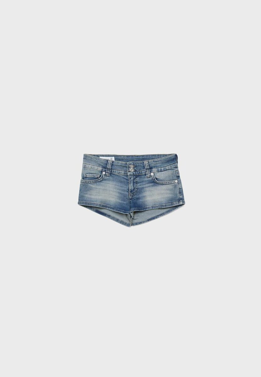 Pantaloncini in denim a vita bassa con ampia fascia in vita e passanti per cintura. Tasche anteriori e tasche posteriori applicate con patta abbottonata. Chiusura frontale con zip e doppia chiusura con bottoni in metallo.