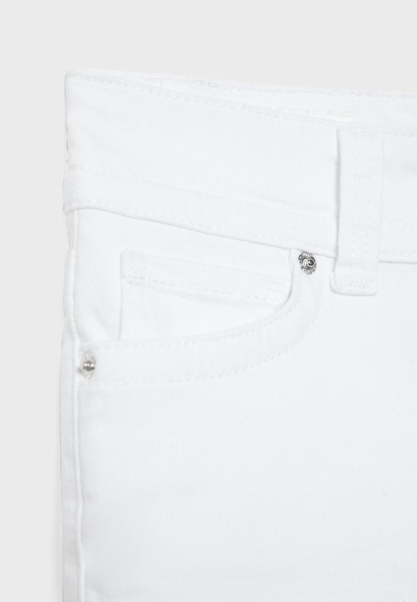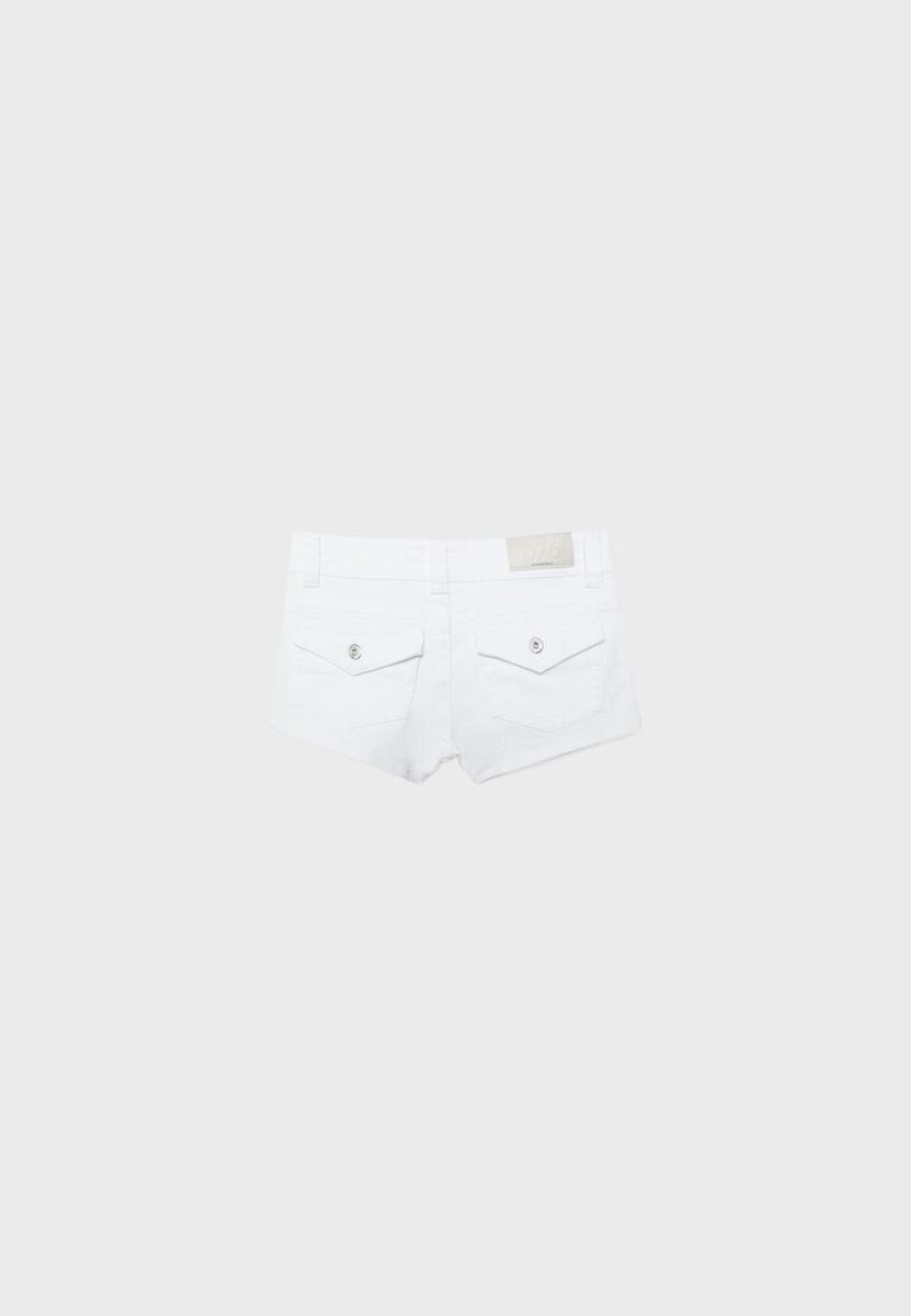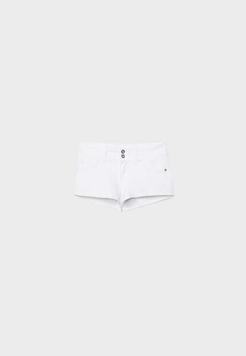 Pantaloncini in denim a vita bassa con ampia fascia in vita e passanti per cintura. Dotati di tasche anteriori e tasche applicate posteriori con patta abbottonata. Chiusura frontale con zip e doppia chiusura con bottoni in metallo.