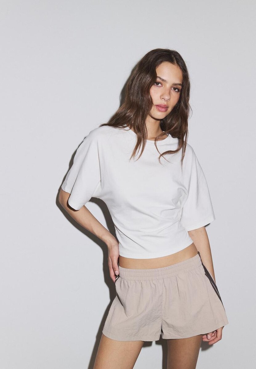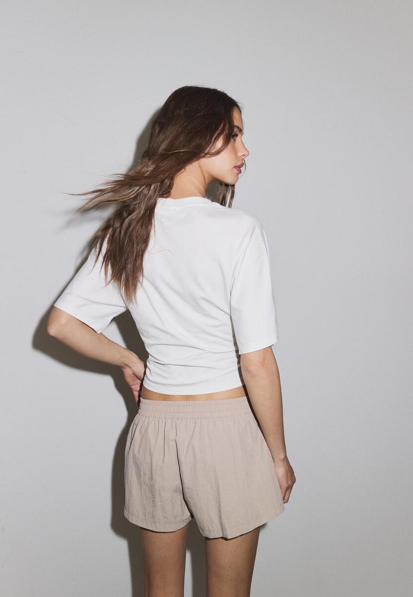 Pantaloncini fluidi realizzati in tessuto tecnico. Caratterizzati da vita alta e fascia elastica con strisce laterali a contrasto.