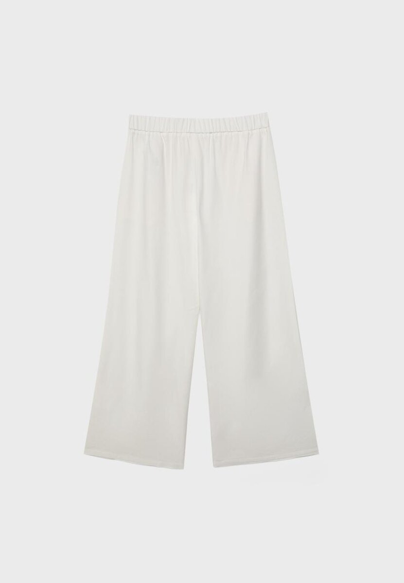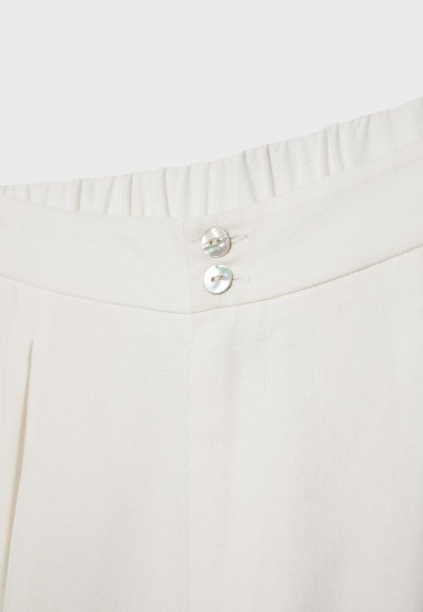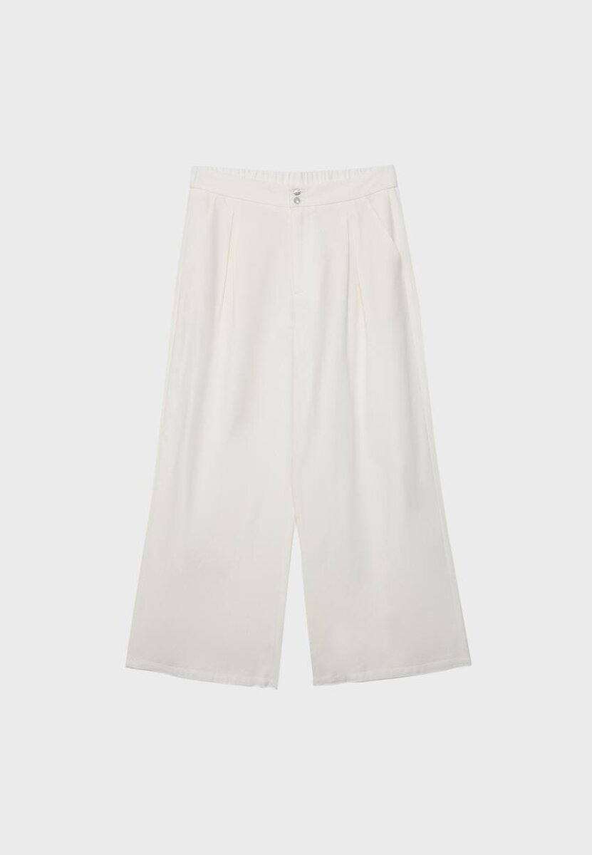 Culotte a vita alta in tessuto effetto rustico. Caratterizzate da gamba dritta e Wide Leg, chiusura con doppio bottone, elastico in vita sul retro e tasche laterali. Disponibili in vari colori.