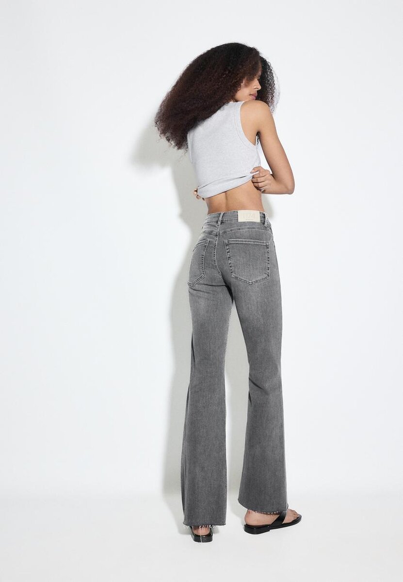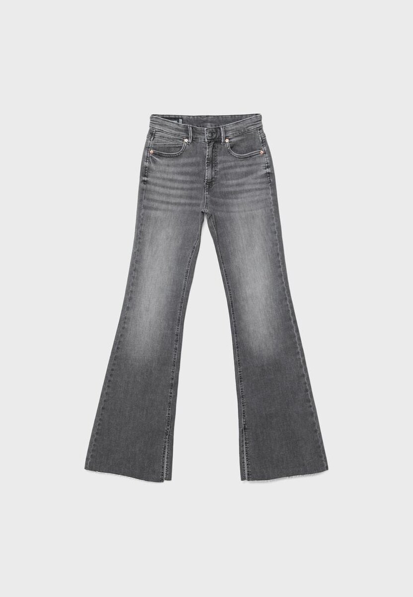 Jeans a vita alta con tasche laterali. Tasche posteriori applicate. Vita con passanti per cintura. Flared Hem. Caratterizzati da un orlo consumato con spacco interno laterale. Chiusura frontale con zip e bottone in metallo. Disponibili in vari colori.